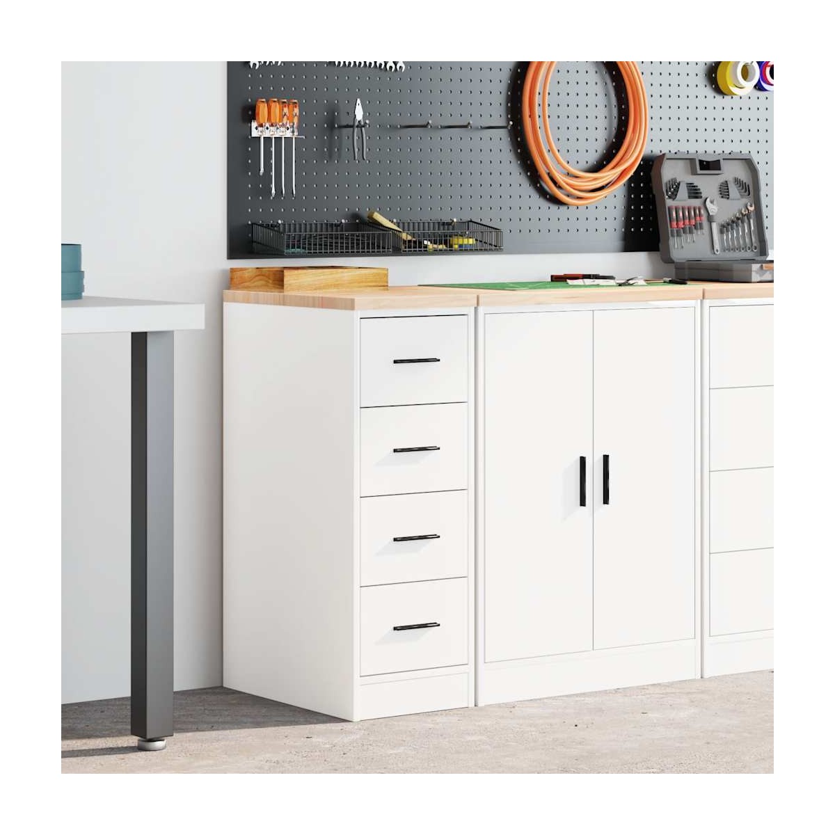 Este armario de almacenamiento de garaje es una excelente opción para organizar todas sus herramientas y materiales de bricolaje en el garaje, el trastero o el taller. Durable y de larga duración: este gabinete de garaje está hecho de madera de pino duradera y madera de ingeniería, lo que garantiza estabilidad y robustez para un uso duradero.Amplio espacio de almacenamiento: con cuatro cajones espaciosos, este gabinete de herramientas le permite mantener las herramientas de uso frecuente al alcance de la mano, lo que hace que sea conveniente acceder a todo lo que necesita para su próximo proyecto.Superficie de trabajo versátil: la encimera de madera proporciona una superficie resistente para diversas tareas, como reparaciones, montajes o proyectos de bricolaje.Fácil de mantener: Gracias a su superficie lisa, el armario es fácil de limpiar con un paño húmedo y requiere menos mantenimiento.Amplias aplicaciones: este gabinete de almacenamiento de garaje proporciona mucho espacio seguro, lo que lo hace ideal para organizar artículos en diversos entornos, como garajes, oficinas, lavaderos, despensas, sótanos o talleres. Advertencia:Para evitar que vuelque, este producto debe usarse con el dispositivo de fijación a la pared suministrado.