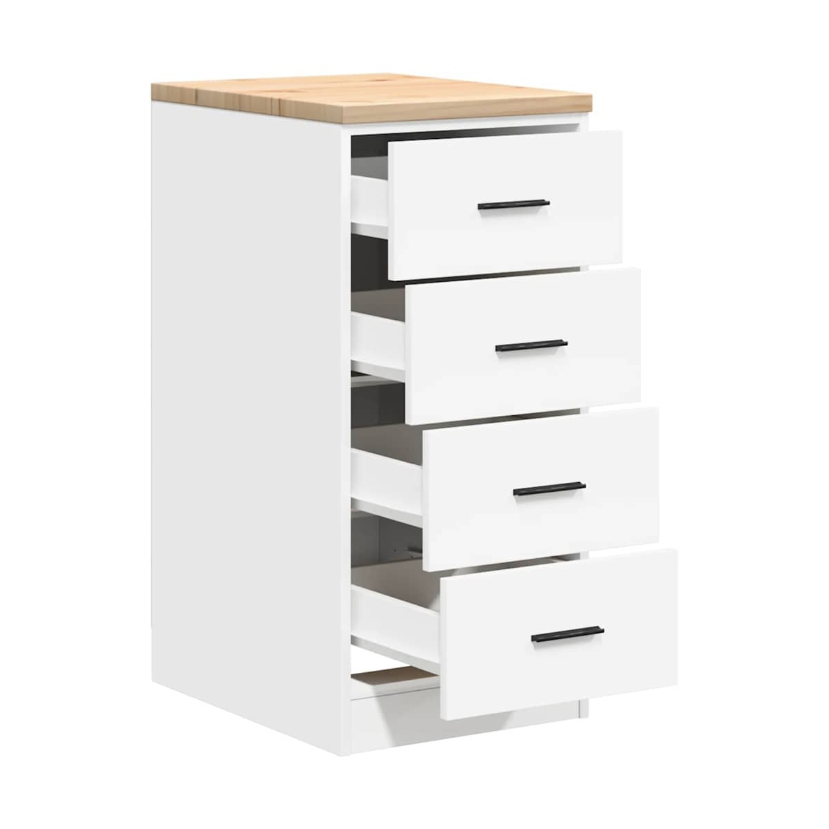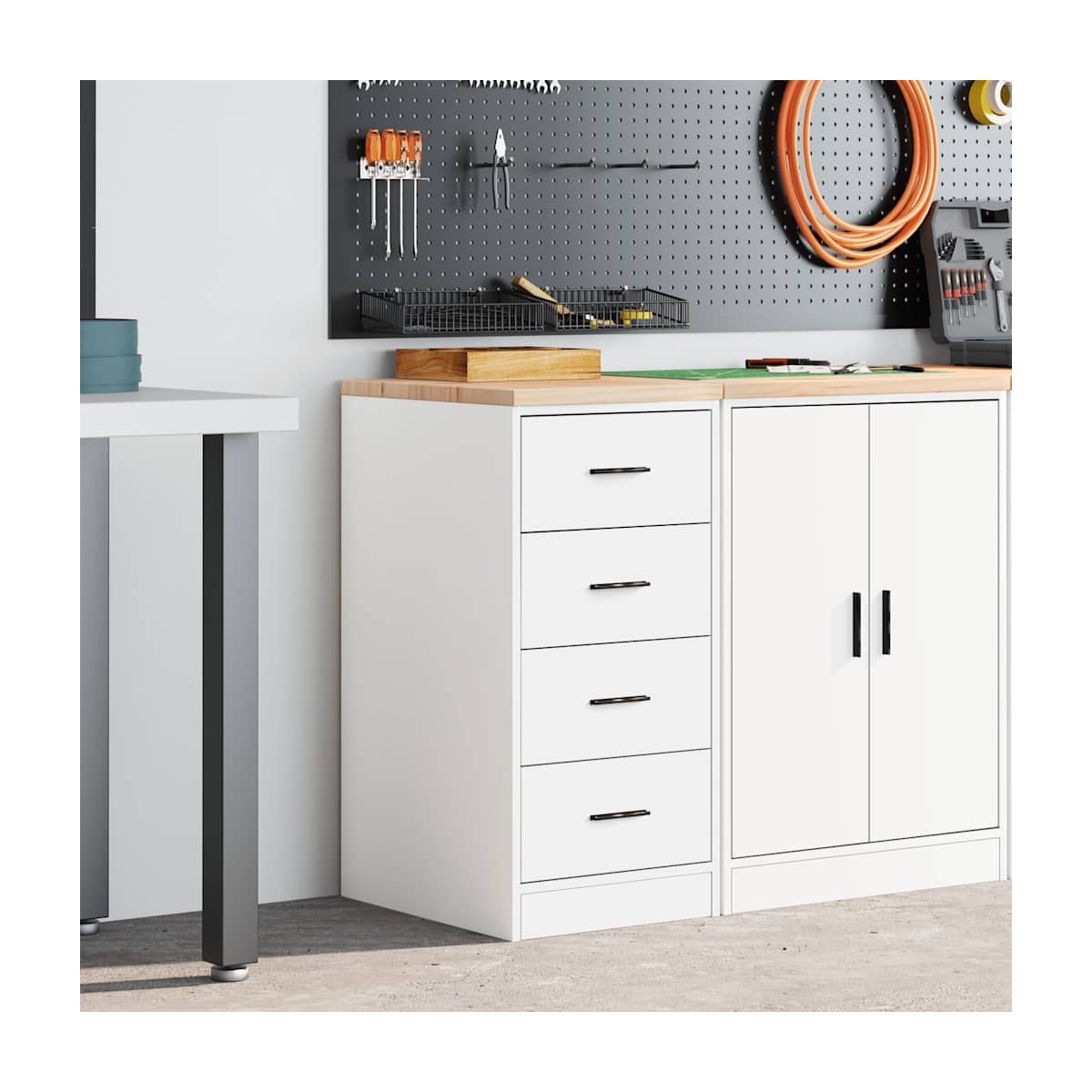 Este armario de almacenamiento de garaje es una excelente opción para organizar todas sus herramientas y materiales de bricolaje en el garaje, el trastero o el taller. Durable y de larga duración: este gabinete de garaje está hecho de madera de pino duradera y madera de ingeniería, lo que garantiza estabilidad y robustez para un uso duradero.Amplio espacio de almacenamiento: con cuatro cajones espaciosos, este gabinete de herramientas le permite mantener las herramientas de uso frecuente al alcance de la mano, lo que hace que sea conveniente acceder a todo lo que necesita para su próximo proyecto.Superficie de trabajo versátil: la encimera de madera proporciona una superficie resistente para diversas tareas, como reparaciones, montajes o proyectos de bricolaje.Fácil de mantener: Gracias a su superficie lisa, el armario es fácil de limpiar con un paño húmedo y requiere menos mantenimiento.Amplias aplicaciones: este gabinete de almacenamiento de garaje proporciona mucho espacio seguro, lo que lo hace ideal para organizar artículos en diversos entornos, como garajes, oficinas, lavaderos, despensas, sótanos o talleres. Advertencia:Para evitar que vuelque, este producto debe usarse con el dispositivo de fijación a la pared suministrado.