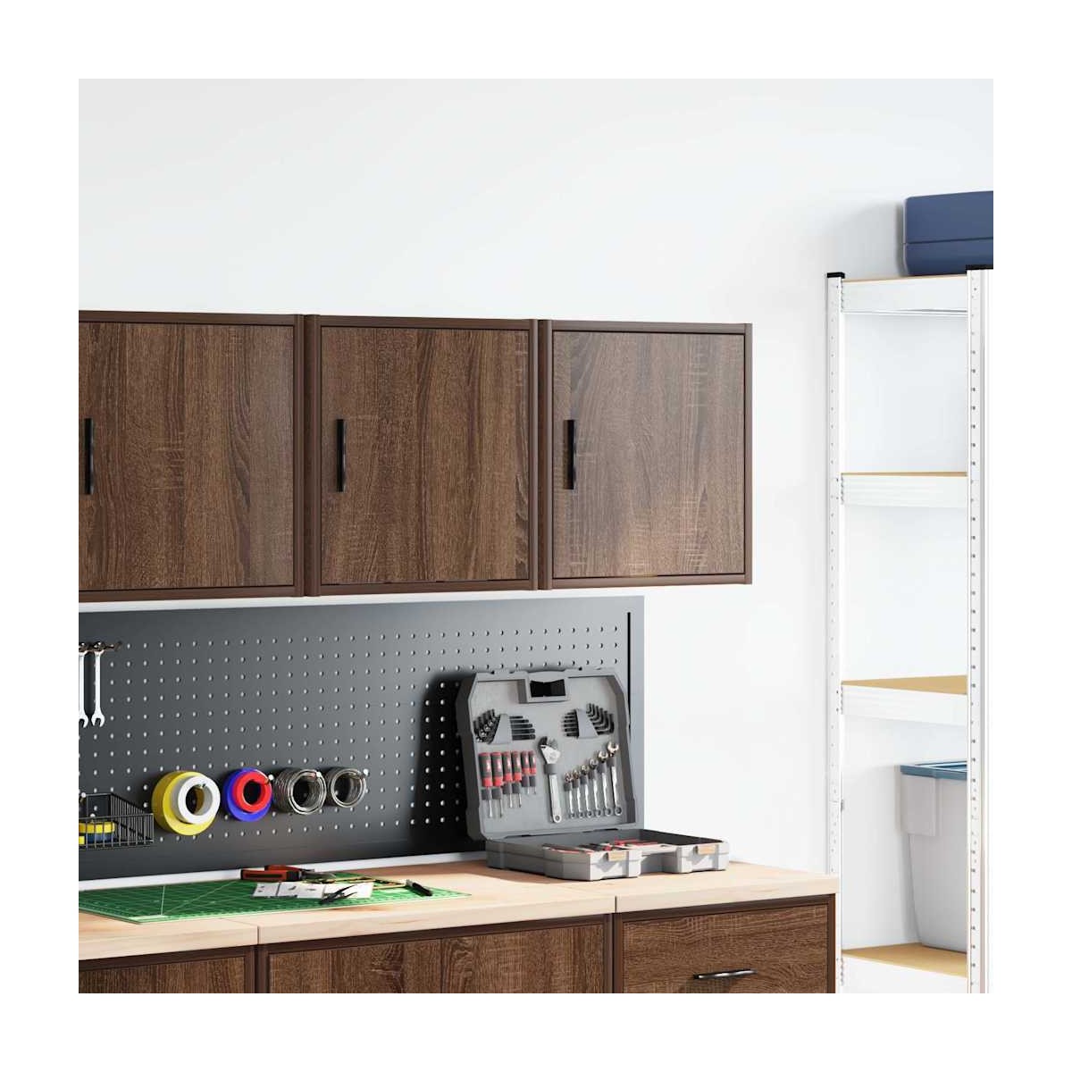 Estos gabinetes de pared para garaje son perfectos para guardar herramientas y accesorios sin ocupar espacio en el piso. Material estable y duradero: La madera de ingeniería es un material duradero y estable con una superficie lisa que es resistente a la humedad, la deformación y la rotura, lo que la convierte en una opción fiable para una variedad de proyectos.Amplio espacio de almacenamiento: con un espacioso compartimento detrás de la puerta, el armario de pared del garaje ofrece fácil acceso a sus herramientas y accesorios.Práctica puerta: La puerta ayuda a mantener un espacio limpio y organizado ocultando pequeños objetos esenciales y desorden detrás de ellos.Fácil de mantener: Gracias a su superficie lisa, el armario es fácil de limpiar con un paño húmedo y requiere menos mantenimiento.Amplias aplicaciones: este gabinete de almacenamiento de garaje proporciona mucho espacio seguro, lo que lo hace ideal para organizar artículos en diversos entornos, como garajes, oficinas, lavaderos, despensas, sótanos o talleres. Información útil:Los tornillos y los tacos para el interior de la pared no están incluidos. Recomendamos encontrar y utilizar tornillos y tacos adecuados específicamente para las paredes. Si no estás seguro, puedes consultar con un profesional. Lee y sigue cada paso de las instrucciones.