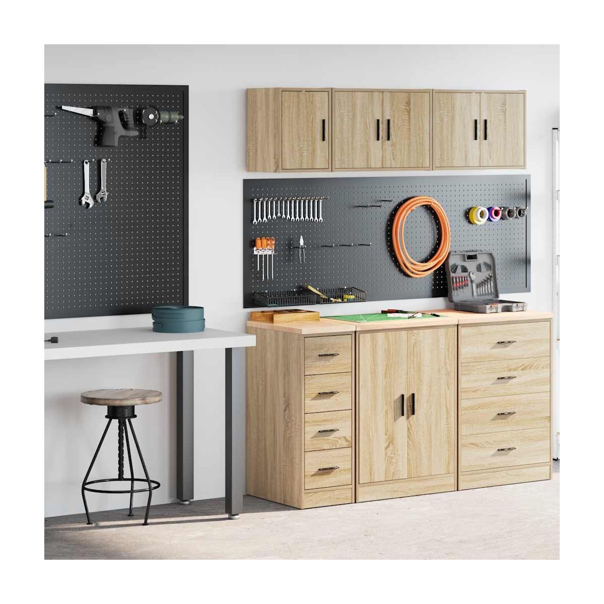 Estos armarios de garaje son una excelente opción para organizar todas sus herramientas y materiales de bricolaje en el garaje, trastero o taller. Durable y de larga duración: este gabinete de garaje está hecho de madera de pino duradera y madera de ingeniería, lo que garantiza estabilidad y robustez para un uso duradero.Amplio espacio de almacenamiento: este gabinete de herramientas le permite mantener sus herramientas de uso frecuente a su alcance, lo que hace que sea conveniente acceder a todo lo que necesita para su próximo proyecto.Superficie de trabajo versátil: la encimera de madera proporciona una superficie resistente para diversas tareas, como reparaciones, montajes o proyectos de bricolaje.Fácil de mantener: Gracias a su superficie lisa, el armario es fácil de limpiar con un paño húmedo y requiere menos mantenimiento.Amplias aplicaciones: este gabinete de almacenamiento de garaje proporciona mucho espacio seguro, lo que lo hace ideal para organizar artículos en diversos entornos, como garajes, oficinas, lavaderos, despensas, sótanos o talleres.Opciones de montaje flexibles: Las puertas del compartimiento se pueden instalar a la izquierda o a la derecha según tu conveniencia y hábitos personales. Información útil:Los tornillos y los tacos para el interior de la pared no están incluidos. Recomendamos encontrar y utilizar tornillos y tacos adecuados específicamente para las paredes. Si no estás seguro, puedes consultar con un profesional. Lee y sigue cada paso de las instrucciones. Advertencia:Para evitar que vuelque, este producto debe usarse con el dispositivo de fijación a la pared suministrado.