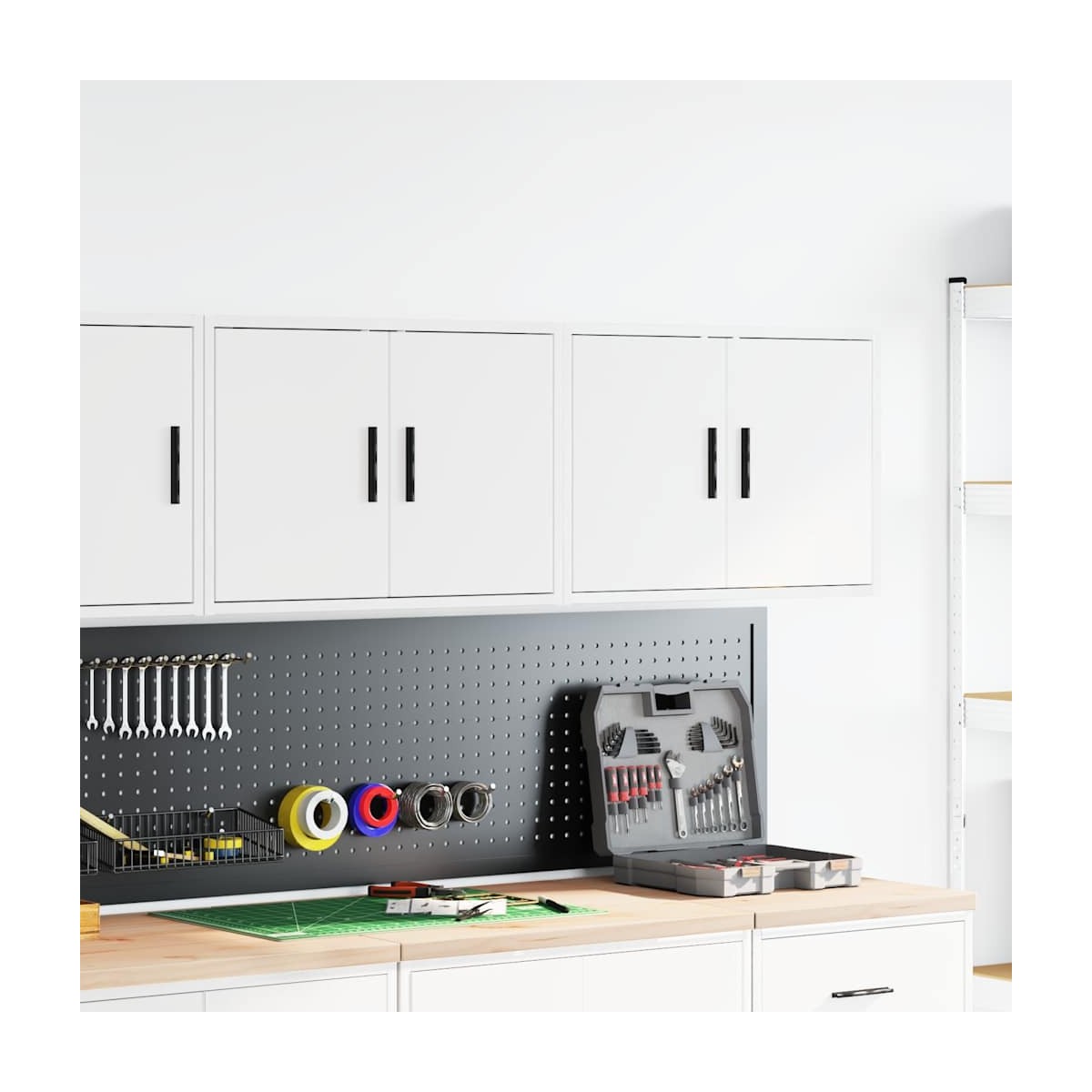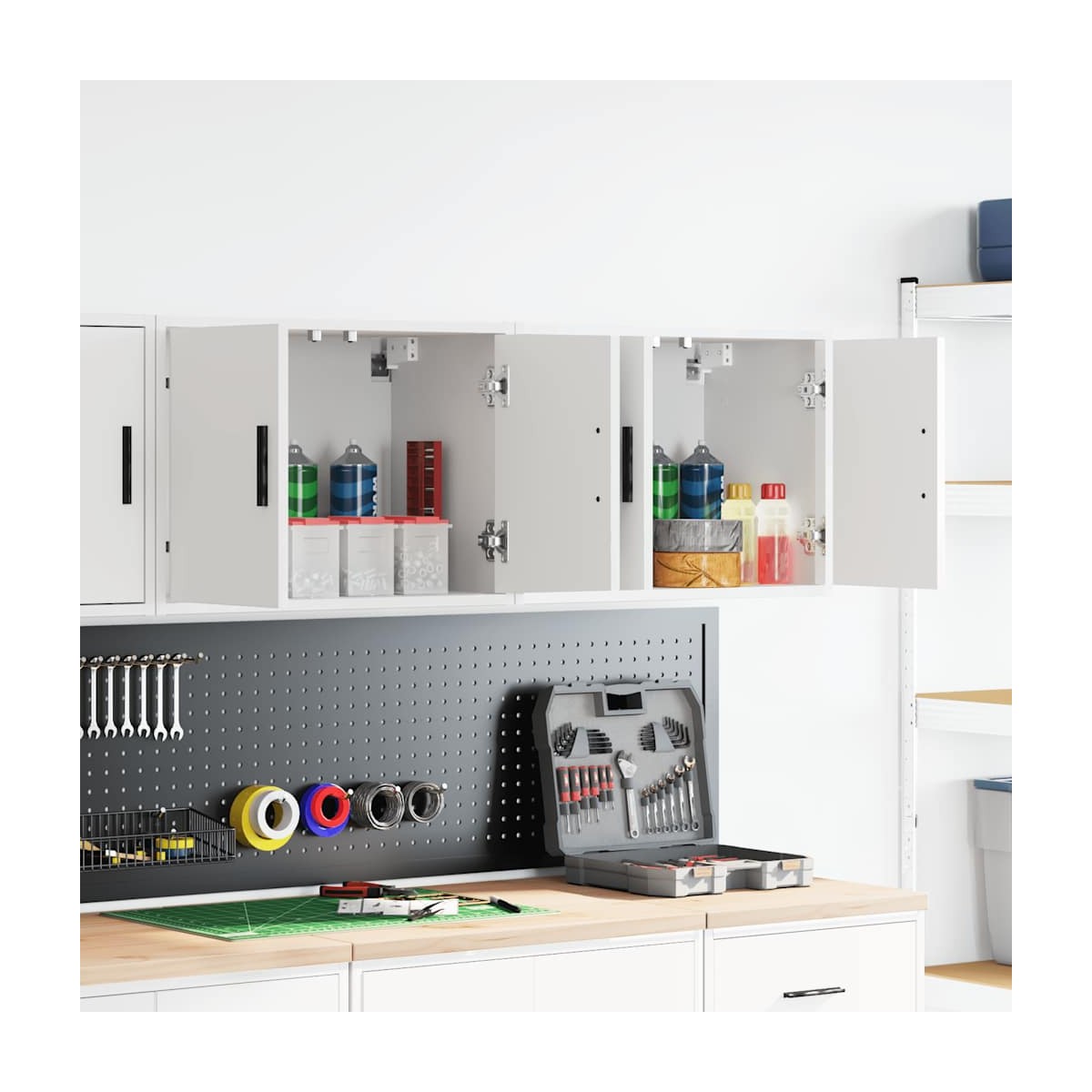 Estos gabinetes de pared para garaje son perfectos para guardar herramientas y accesorios sin ocupar espacio en el piso. Material estable y duradero: La madera de ingeniería es un material duradero y estable con una superficie lisa que es resistente a la humedad, la deformación y la rotura, lo que la convierte en una opción fiable para una variedad de proyectos.Amplio espacio de almacenamiento: con un espacioso compartimento detrás de la puerta, el armario de pared del garaje ofrece fácil acceso a sus herramientas y accesorios.Práctica puerta: La puerta ayuda a mantener un espacio limpio y organizado ocultando pequeños objetos esenciales y desorden detrás de ellos.Fácil de mantener: Gracias a su superficie lisa, el armario es fácil de limpiar con un paño húmedo y requiere menos mantenimiento.Amplias aplicaciones: este gabinete de almacenamiento de garaje proporciona mucho espacio seguro, lo que lo hace ideal para organizar artículos en diversos entornos, como garajes, oficinas, lavaderos, despensas, sótanos o talleres. Información útil:Los tornillos y los tacos para el interior de la pared no están incluidos. Recomendamos encontrar y utilizar tornillos y tacos adecuados específicamente para las paredes. Si no estás seguro, puedes consultar con un profesional. Lee y sigue cada paso de las instrucciones.