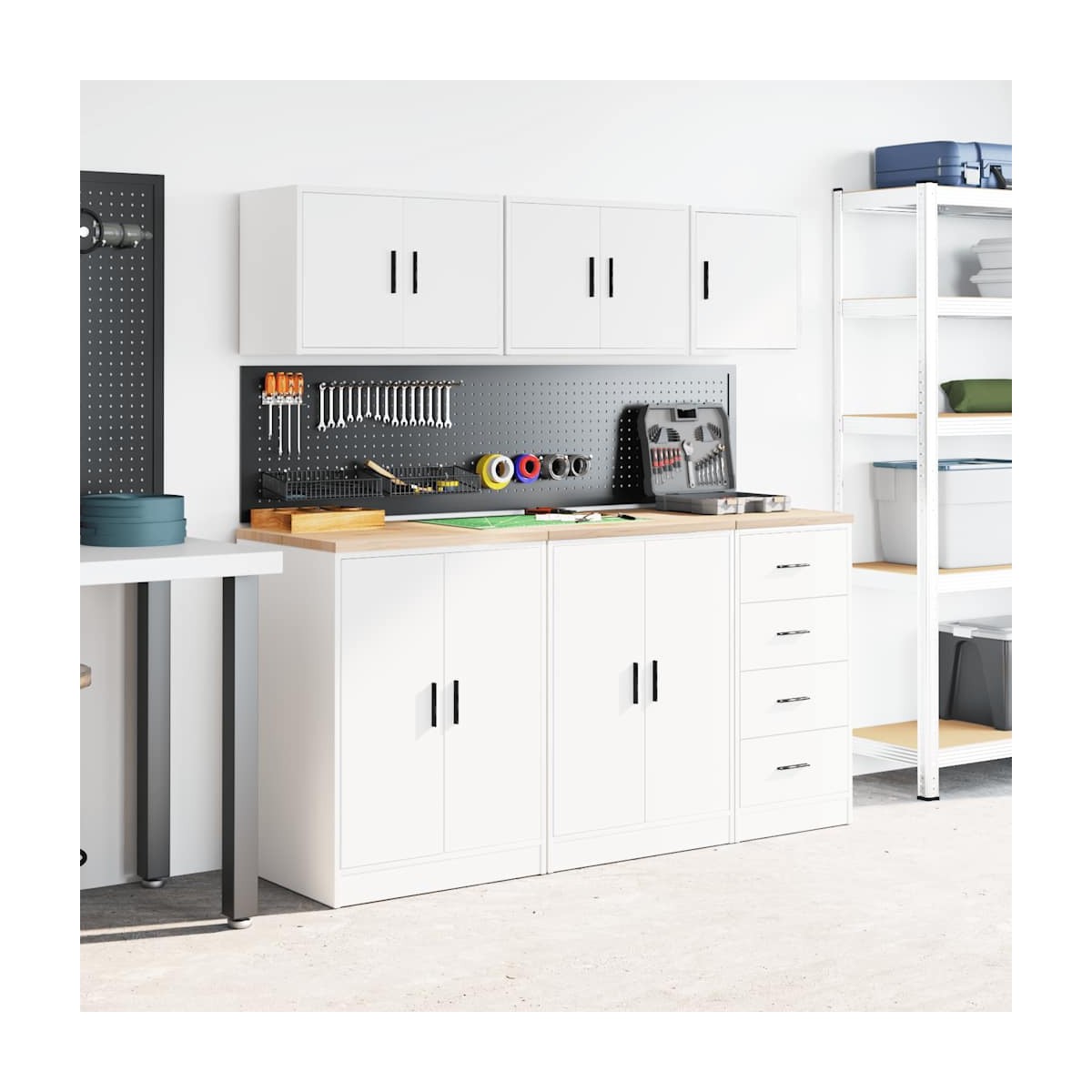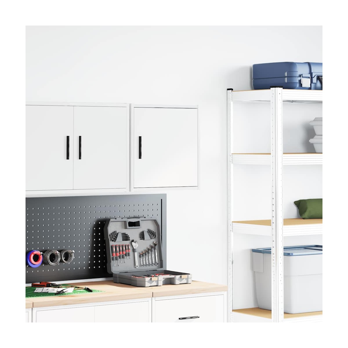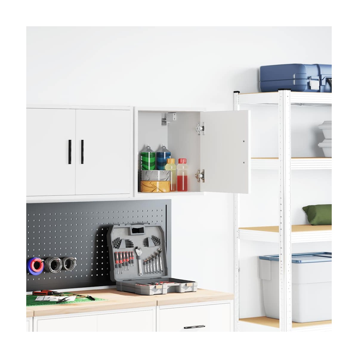 Este armario de pared para garaje es perfecto para guardar herramientas y accesorios sin ocupar espacio en el suelo. Material estable y duradero: La madera de ingeniería es un material duradero y estable con una superficie lisa que es resistente a la humedad, la deformación y la rotura, lo que la convierte en una opción fiable para una variedad de proyectos.Amplio espacio de almacenamiento: con un espacioso compartimento detrás de la puerta, el armario de pared del garaje ofrece fácil acceso a sus herramientas y accesorios.Práctica puerta: La puerta ayuda a mantener un espacio limpio y organizado ocultando pequeños objetos esenciales y desorden detrás de ellos.Fácil de mantener: Gracias a su superficie lisa, el armario es fácil de limpiar con un paño húmedo y requiere menos mantenimiento.Amplias aplicaciones: este gabinete de almacenamiento de garaje proporciona mucho espacio seguro, lo que lo hace ideal para organizar artículos en diversos entornos, como garajes, oficinas, lavaderos, despensas, sótanos o talleres. Información útil:Los tornillos y los tacos para el interior de la pared no están incluidos. Recomendamos encontrar y utilizar tornillos y tacos adecuados específicamente para las paredes. Si no estás seguro, puedes consultar con un profesional. Lee y sigue cada paso de las instrucciones.