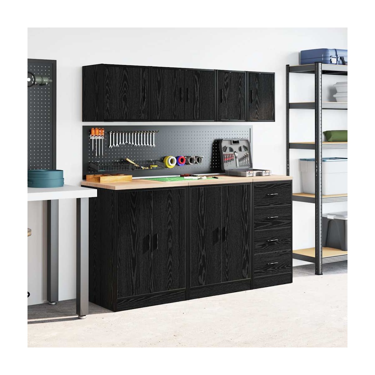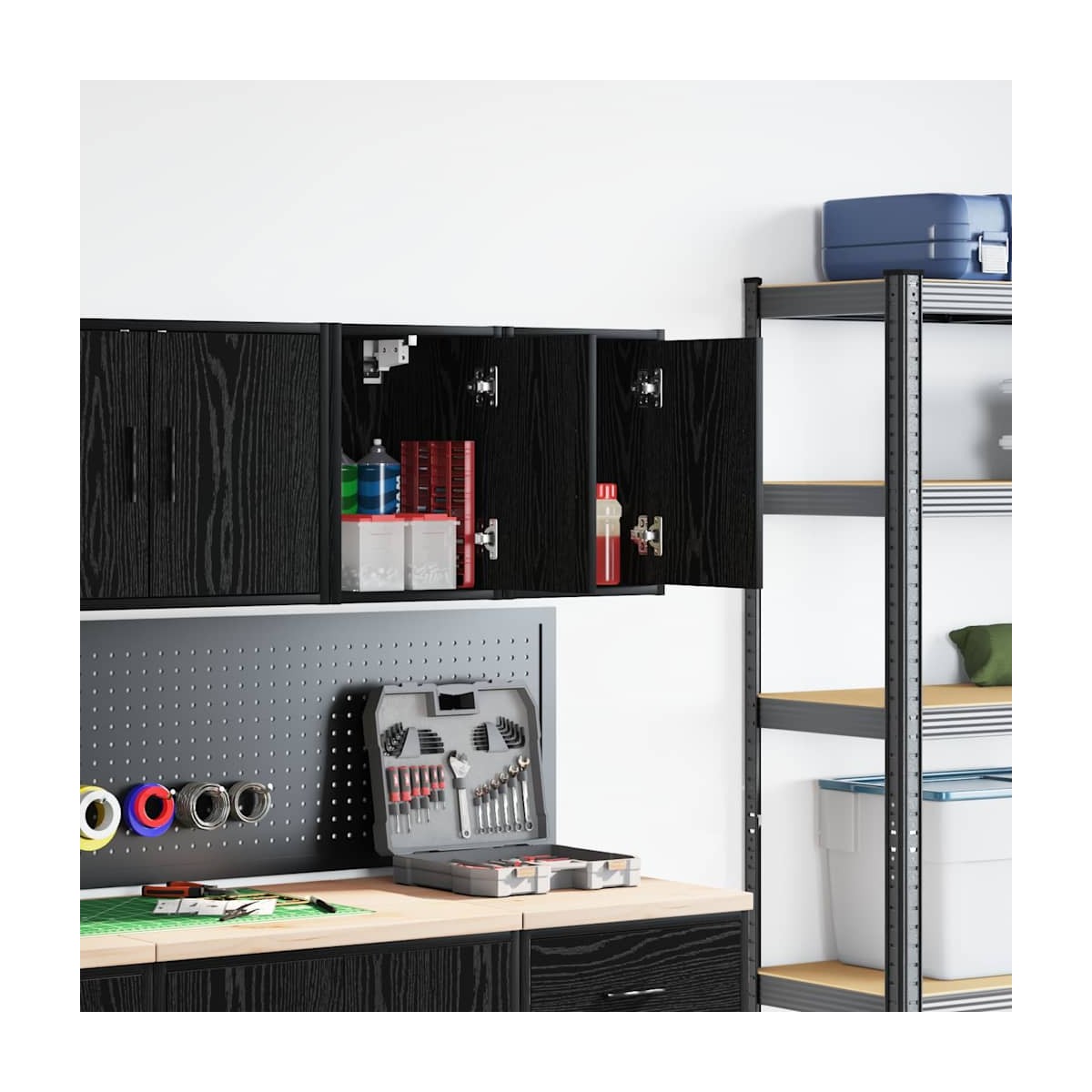 Estos gabinetes de pared para garaje son perfectos para guardar herramientas y accesorios sin ocupar espacio en el piso. Material estable y duradero: La madera de ingeniería es un material duradero y estable con una superficie lisa que es resistente a la humedad, la deformación y la rotura, lo que la convierte en una opción fiable para una variedad de proyectos.Amplio espacio de almacenamiento: con un espacioso compartimento detrás de la puerta, el armario de pared del garaje ofrece fácil acceso a sus herramientas y accesorios.Práctica puerta: La puerta ayuda a mantener un espacio limpio y organizado ocultando pequeños objetos esenciales y desorden detrás de ellos.Fácil de mantener: Gracias a su superficie lisa, el armario es fácil de limpiar con un paño húmedo y requiere menos mantenimiento.Amplias aplicaciones: este gabinete de almacenamiento de garaje proporciona mucho espacio seguro, lo que lo hace ideal para organizar artículos en diversos entornos, como garajes, oficinas, lavaderos, despensas, sótanos o talleres. Información útil:Los tornillos y los tacos para el interior de la pared no están incluidos. Recomendamos encontrar y utilizar tornillos y tacos adecuados específicamente para las paredes. Si no estás seguro, puedes consultar con un profesional. Lee y sigue cada paso de las instrucciones.