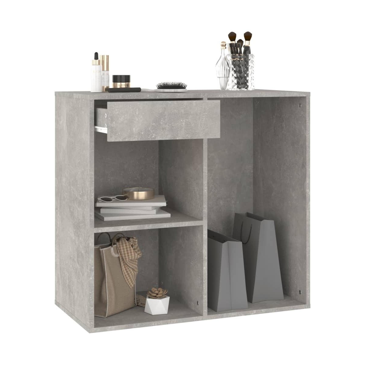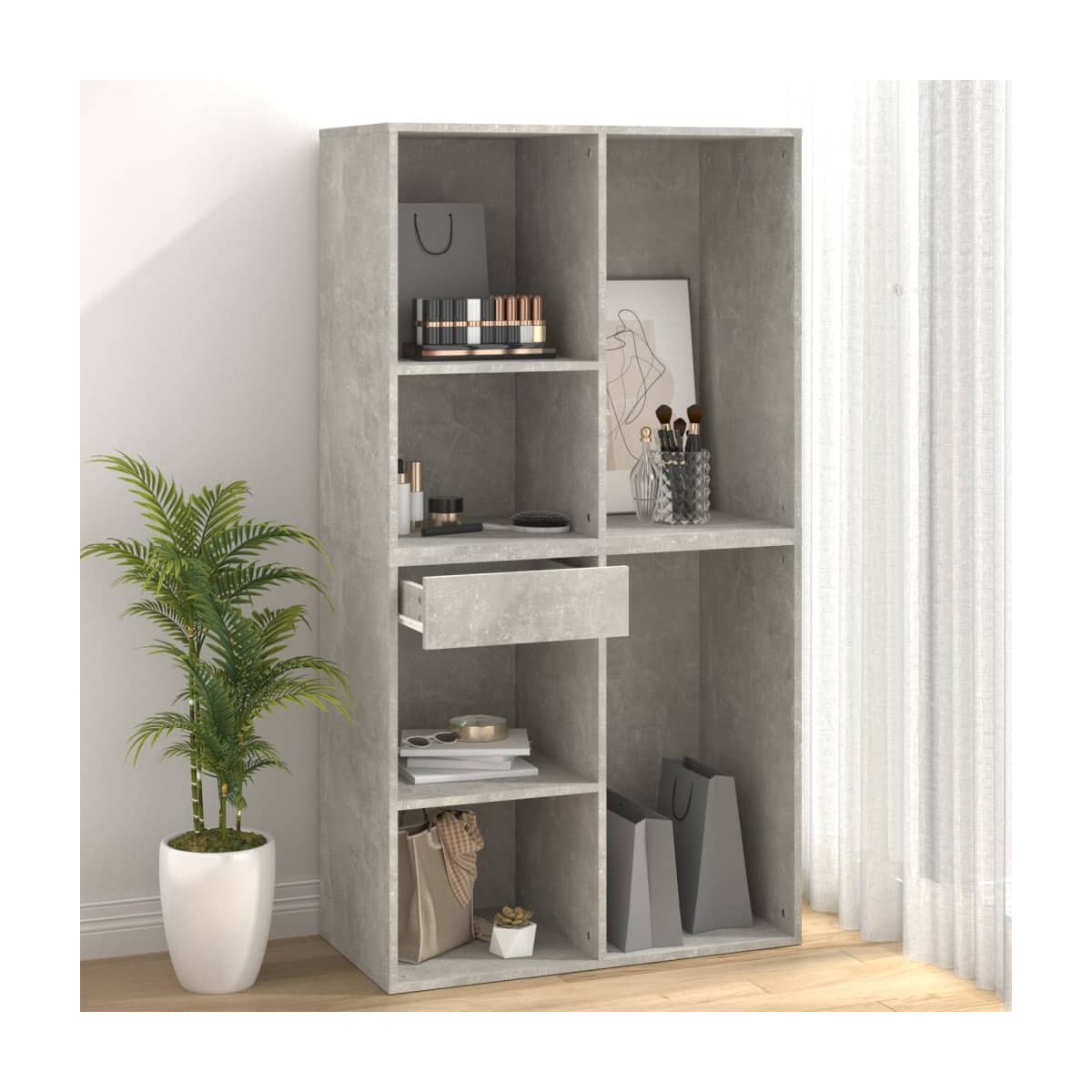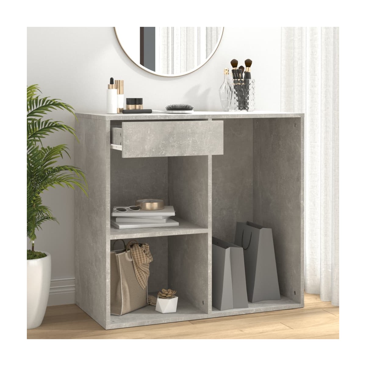 ¡Di adiós a perder cosas y consigue este elegante y práctico armario para maquillaje! Combina diseño, practicidad y modernidad. Material robusto: La madera contrachapada tiene una calidad excepcional, con una superficie lisa y también cuenta con fuerza, estabilidad y resistencia a la humedad.Diseño práctico: Este armario de almacenaje se puede usar por separado o combinarse como quieras. Así que puedes mezclar este armario de almacenaje con el tocador para crear tu propia solución de almacenaje.Amplio espacio de almacenaje: El armario de maquillaje dispone de mucho espacio, con un cajón y compartimentos, perfecto para organizar el maquillaje, los accesorios, los neceseres y otros básicos de belleza. Advertencia:Para evitar el vuelco, este producto debe usarse con el dispositivo provisto para fijarlo a la pared. Nota:Cada producto viene con un manual de montaje en la caja para facilitar el montaje.