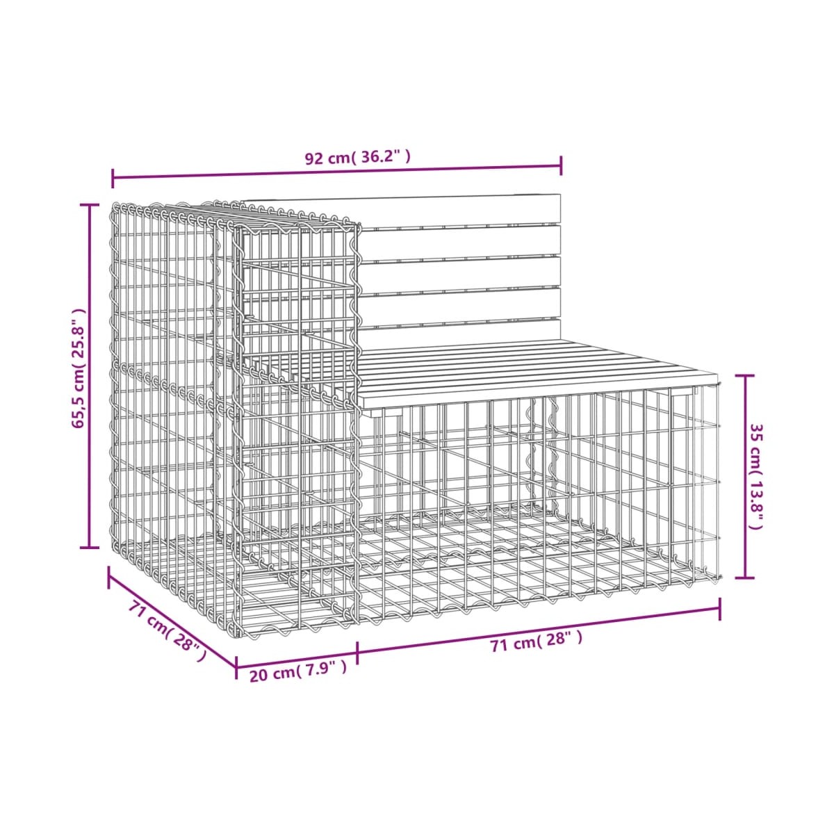 ¡Crea tu propio espacio para sentarte al aire libre con este banco de jardín!Este banco de jardín llamará la atención en tu espacio al aire libre. Madera impregnada: La parte superior del asiento de jardín es de madera de pino impregnada al vacío con el fin de lograr una mayor durabilidad. La madera maciza de pino es un hermoso material natural. Tiene vetas rectas y los nudos le dan un aspecto rústico característico. La impregnación es un proceso de conservación que se realiza mediante autoclaves. El tratamiento a presión aumenta la resistencia a la putrefacción y a la intemperie.Base resistente y estable: Este banco de exterior cuenta con una base de cesta de gaviones de acero galvanizado que está diseñada para llenarse con rocas y grava para una belleza adicional.La rejilla de malla de la cesta de gaviones está soldada con alambres transversales y longitudinales en cada intersección para mayor estabilidad.Diseño compacto: Este banco de jardín es perfecto para un espacio limitado gracias a su diseño estrecho y compacto.Amplia gama de usos: Este banco de parque es adecuado para jardines, patios traseros, espacios de patio, ubicaciones de esquinas secretas y más. Información útil:Para asegurarte de que tus muebles de exterior se mantengan hermosos, recomendamos protegerlos con una funda impermeable.