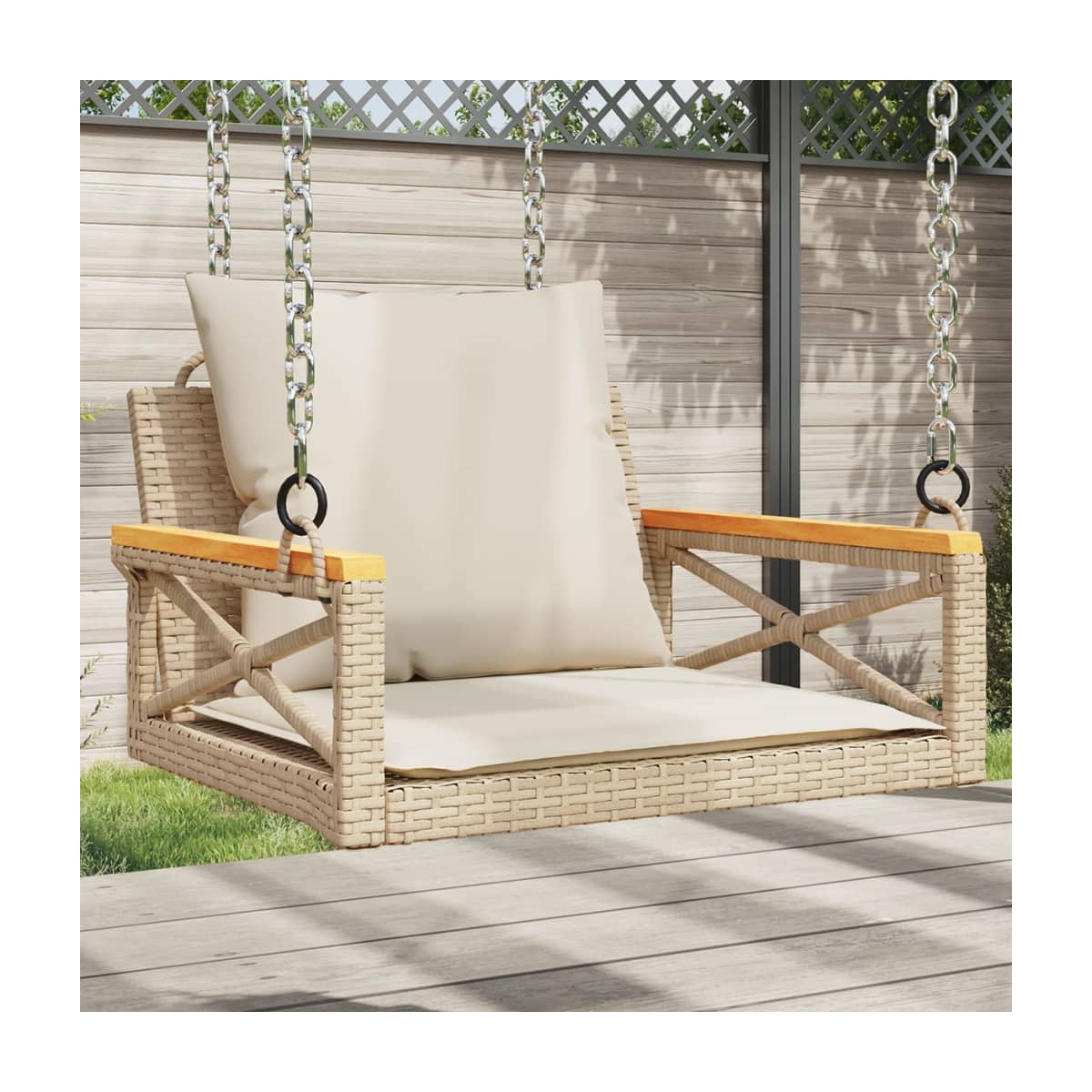 Este banco columpio con cojines es la elección perfecta si estás buscando poder relajarte y disfrutar de espacios al aire libre. Material duradero: El ratán PE, también conocido como ratán sintético, es un material sintético resistente y de bajo mantenimiento que se parece al ratán natural. Es ligero, fácil de limpiar y se usa comúnmente para muebles de exterior debido a su durabilidad y propiedades resistentes a la intemperie.Experiencia de asiento cómoda: Estos muebles de exterior, completos con cojines acolchados gruesos, ofrecen una experiencia de asiento cómoda.Función de columpio: Experimenta la máxima relajación mientras te meces suavemente con la brisa en el asiento colgante con función de columpio.Prácticos anillos de fijación: Los muebles de exterior están equipados con anillos de fijación, lo que hace que sea conveniente colgarlos en árboles grandes, soportes y otros objetos resistentes.Estructura robusta y estable: La estructura de acero con recubrimiento en polvo garantiza que el mueble de jardín sea resistente y estable para usarlo a diario al aire libre. Información útil:Para asegurarte de que tus muebles de exterior se mantengan hermosos, recomendamos protegerlos con una funda impermeable.La entrega incluye sólo un banco de columpio. La estructura del columpio y las cadenas para colgar no están incluidas.