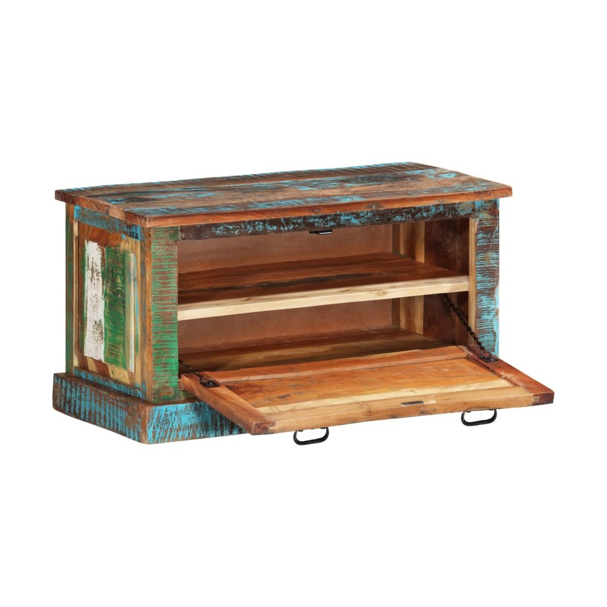 Este banco de madera para guardar zapatos tiene un aspecto único y te permite sentarte cómodamente mientras te quitas o te pones los zapatos. Con 2 amplios compartimentos interiores, este banco constituye un lugar muy práctico para guardar ordenadamente los zapatos. Hecha de madera reciclada, este banco de recibidor es sólido, duradero y bonito, y tiene las características de diferentes maderas como teca, madera de mango, acacia, etc. Cada pieza es única y ligeramente diferente de las demás. Los signos de desgaste y la estructura visible de las vetas le dan a cada pieza un aspecto único y le añaden un espectacular estilo vintage. Este banco con zapatero está hecho a mano. Cada paso del proceso se lleva a cabo con el mayor cuidado, ya sea el pulido, la pintura o el lacado. El artículo ya está montado; no requiere montaje. Nota importante: Los colores pueden variar de una pieza a otra, por lo que cada uno de nuestros bancos de almacenamiento es único. La entrega es aleatoria, lo que garantiza la exclusividad e individualidad del producto.