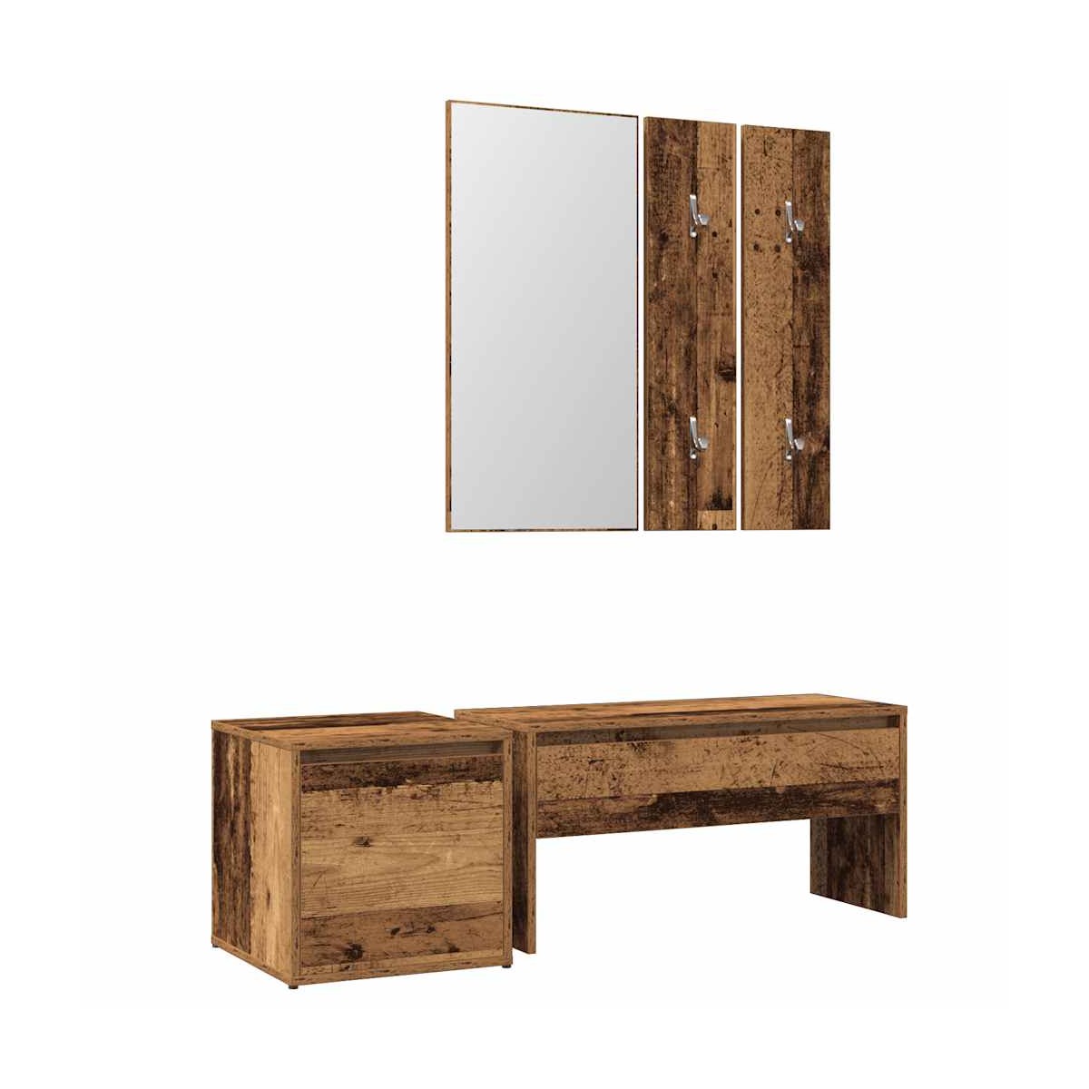 ¡Crea un ambiente cálido y acogedor justo al lado de la puerta con este juego de muebles de pasillo! Material robusto: La madera contrachapada tiene una calidad excepcional, con una superficie lisa y también cuenta con fuerza, estabilidad y resistencia a la humedad.Amplio almacenamiento: Tanto el banco de recibidor como la caja de almacenaje cuentan con un cajón, lo que proporciona un amplio espacio de almacenamiento para mantener zapatos, revistas, libros y DVD ordenados.Uso multifuncional: El banco y la caja se pueden utilizar como almacenamiento y como lugar para poner tus artículos decorativos favoritos en casa. También sirven de asiento cuando te pones o te quitas los zapatos.Diseño práctico: El práctico espejo y los percheros resultan útiles para colgar la ropa y mirarte en el espejo. Información útil:Los tornillos y los tacos para el interior de la pared no están incluidos. Recomendamos encontrar y utilizar tornillos y tacos adecuados específicamente para las paredes. Si no estás seguro, puedes consultar con un profesional. Lee y sigue cada paso de las instrucciones.