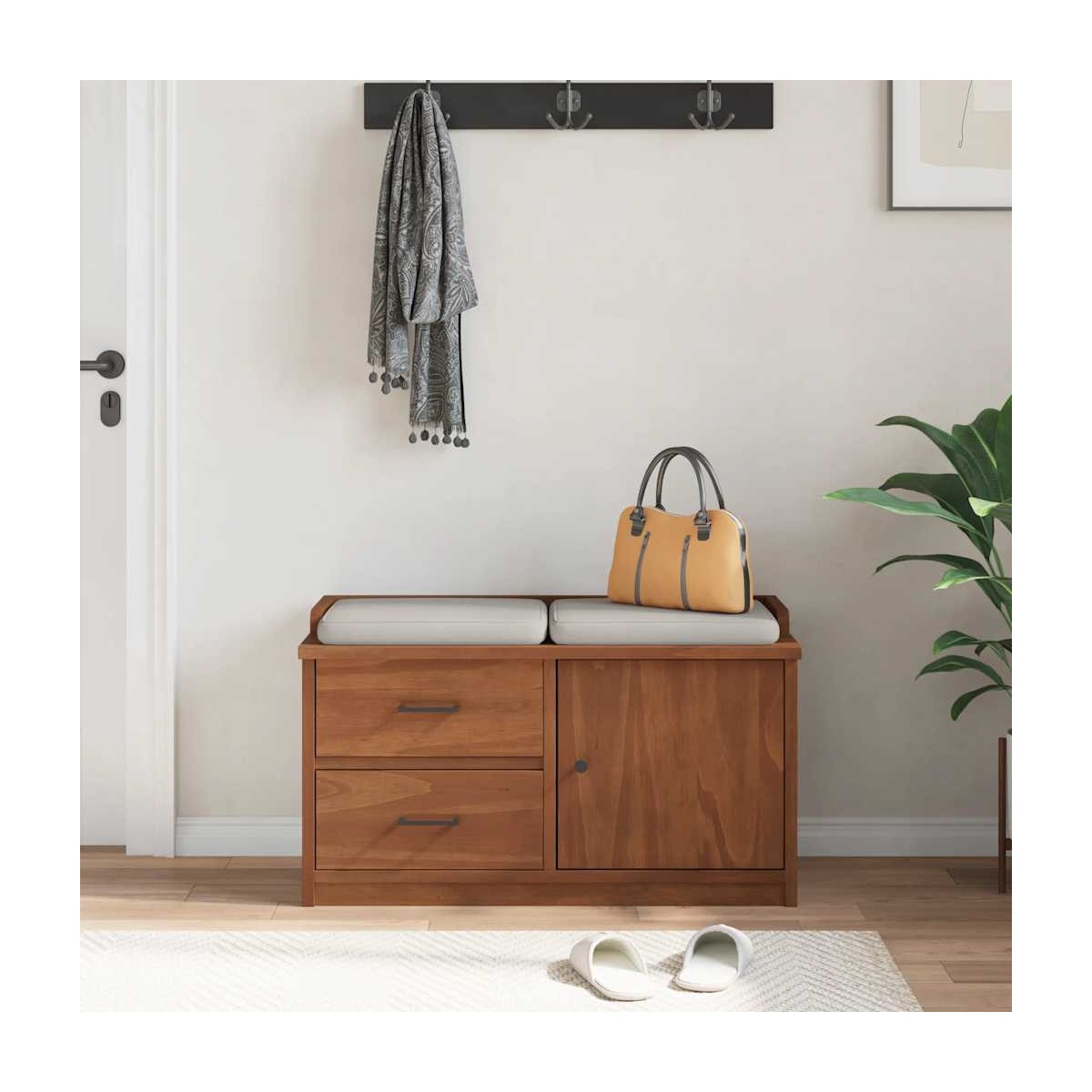 ¡Crea un ambiente cálido y acogedor justo al lado de tu puerta con este banco de pasillo de madera! Material robusto y estable: La madera maciza de pino es conocida por su resistencia y durabilidad. Sus vetas rectas y sus característicos nudos contribuyen a su encanto rústico.Aspecto de madera de acacia: el asiento del recibidor, elaborado con madera de pino maciza con un acabado de madera de acacia, muestra la belleza natural del material y agrega un encanto rústico y un atractivo vibrante a su espacio. Esta combinación no solo mejora su estética, sino que también garantiza durabilidad y longevidad, lo que lo convierte en un complemento perfecto tanto por su estilo como por su funcionalidad.Amplio espacio de almacenamiento: este banco de recibidor ofrece un amplio espacio para guardar ropa, libros, zapatos o pertenencias personales. Por lo tanto, es perfecto para mantener el pasillo, la entrada u otras áreas de la sala de estar ordenadas y sin desorden.Banco de pasillo multifuncional: este banco versátil funciona también como armario de almacenamiento para zapatos y accesorios, y al mismo tiempo proporciona un lugar cómodo para sentarse al ponerse o quitarse los zapatos en el pasillo.Barniz UV: El barniz UV es un tipo especial de barniz que se acaba con una máquina de secado ultravioleta. Crea un acabado más vívido, más lujoso y más táctil en comparación con los barnices que no son UV. Advertencia:Para evitar que vuelque, este producto debe usarse con el dispositivo de fijación a la pared suministrado.