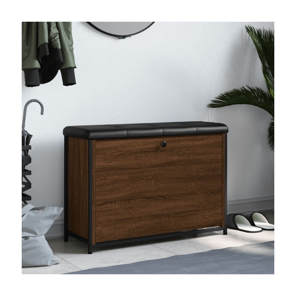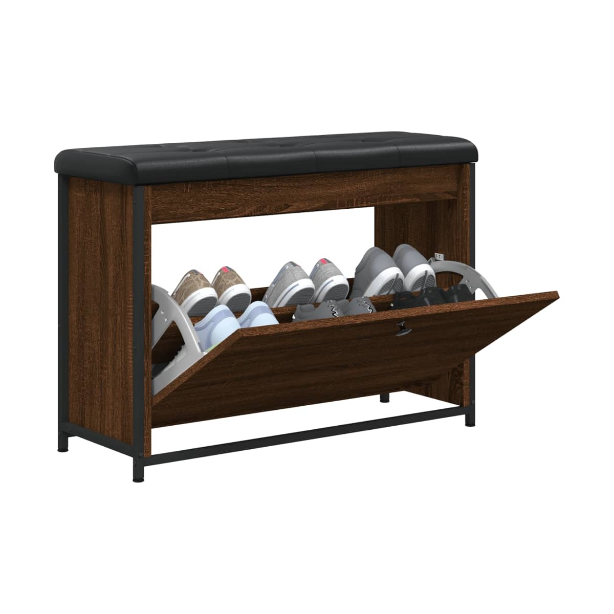 ¡Ten los zapatos ordenados y siempre a mano con este banco zapatero! Construcción resistente: La madera de ingeniería tiene una calidad excepcional y una superficie lisa y se caracteriza por su fuerza, estabilidad y resistencia a la humedad. Las estructuras metálicas también garantizan la solidez y estabilidad del banco.Amplio espacio de almacenaje: El banco del pasillo tiene un cajón abatible para esconder los zapatos y conseguir así una casa limpia y ordenada.Asiento confortable: El mullido cojín de asiento proporciona una comodidad óptima mientras te pones y te quitas los zapatos.Uso versátil: El banco es perfecto para usarse como banco zapatero en el pasillo, o como banco de almacenaje en el salón.