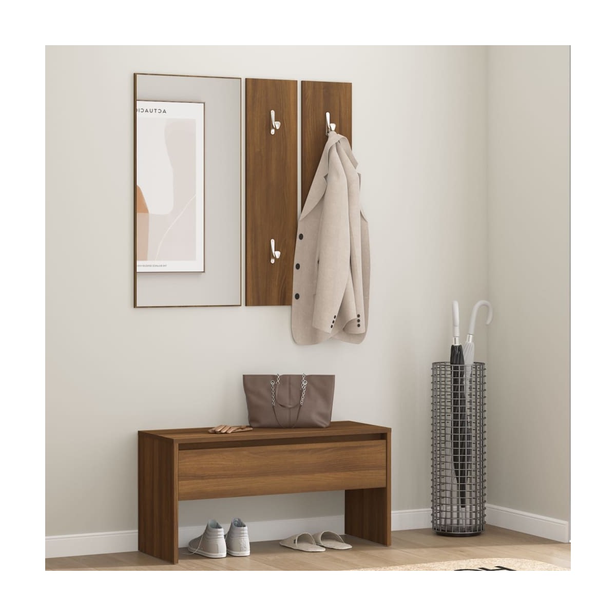 ¡Crea un ambiente cálido y acogedor justo al lado de la puerta con este juego de muebles de recibidor! Material robusto: La madera contrachapada tiene una calidad excepcional, con una superficie lisa y también cuenta con fuerza, estabilidad y resistencia a la humedad.Amplio almacenaje: Con un cajón, el banco de entrada ofrece un amplio espacio de almacenamiento para guardar calzado u otros utensilios.Banco multiusos: El banco no solo se puede usar para guardar cosas o para colocar tus adornos favoritos en la casa, sino que también sirve de asiento para ponerte o quitarte los zapatos.Diseño práctico: El práctico espejo y los percheros resultan útiles para colgar la ropa y echar un vistazo a tu aspecto. Nota:Cada producto viene con un manual de montaje en la caja para facilitar el montaje.Los tornillos y los tacos para el interior de la pared no están incluidos. Busca y utiliza tornillos y tacos adecuados para tus paredes. Si no lo tienes claro, busca asesoramiento profesional. Lee y sigue cada paso de las instrucciones cuidadosamente.