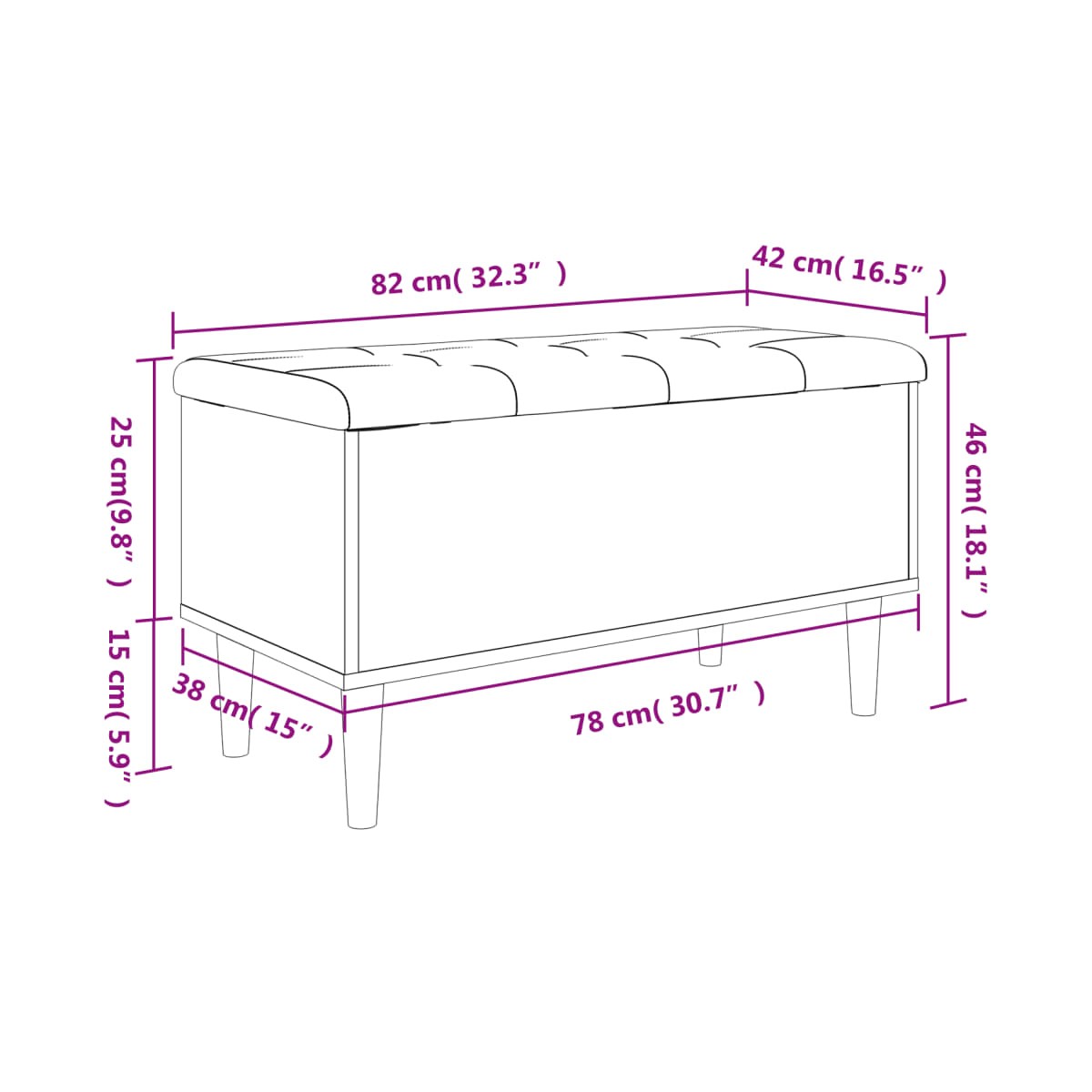- Dimensiones totales (con cojín): 82 x 42 x 46 cm (largo x ancho x alto)