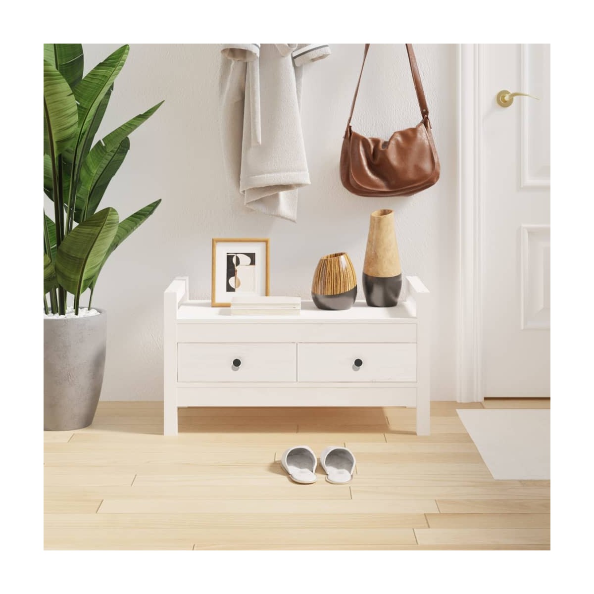 ¡Crea un ambiente cálido y acogedor justo al lado de la puerta con este banco de recibidor de madera! Madera maciza de pino: Este banco de pasillo está hecho de madera maciza de pino. La madera maciza de pino es un bonito material natural. La madera de pino tiene vetas rectas, y los nudos dan al material su distintivo aspecto rústico.Amplio almacenaje: Con 2 cajones, este banco ofrece un amplio espacio para guardar ropa, libros, zapatos o tus objetos personales. Así, el banco de entrada es perfecto para mantener ordenados el pasillo, el recibidor u otras zonas de la casa.Superficie estable: El banco para salón tiene una superficie resistente, ideal para exponer objetos decorativos, marcos de fotos, macetas, etc. La superficie del banco de almacenaje también sirve de asiento. Nota:Cada producto viene con un manual de montaje en la caja para facilitar el montaje.