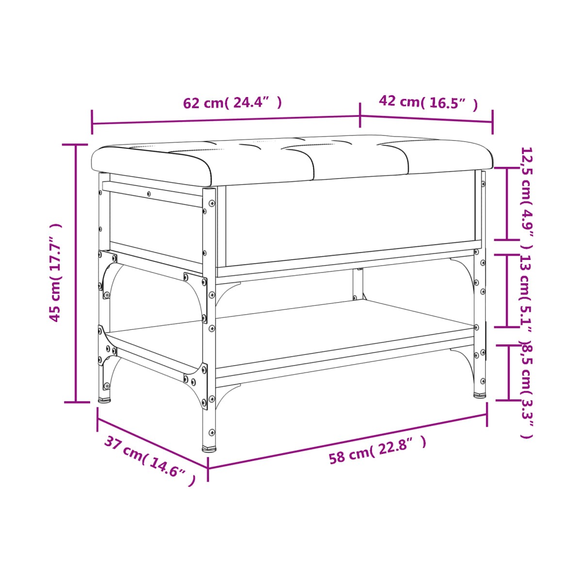 - Dimensiones totales (con cojín): 62 x 42 x 45 cm (largo x ancho x alto)