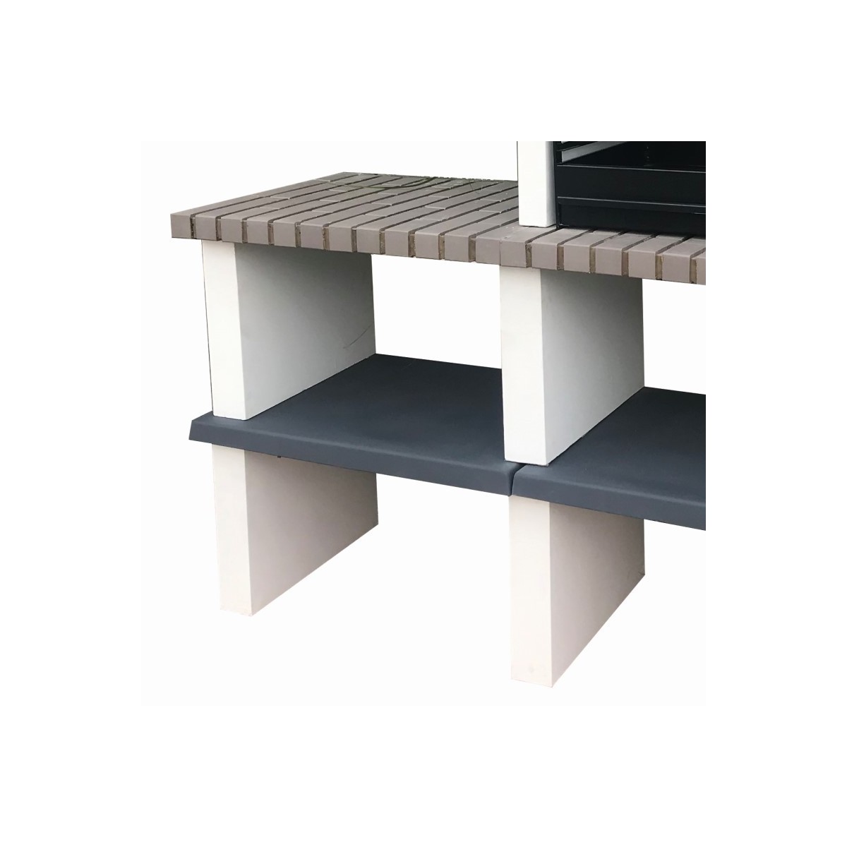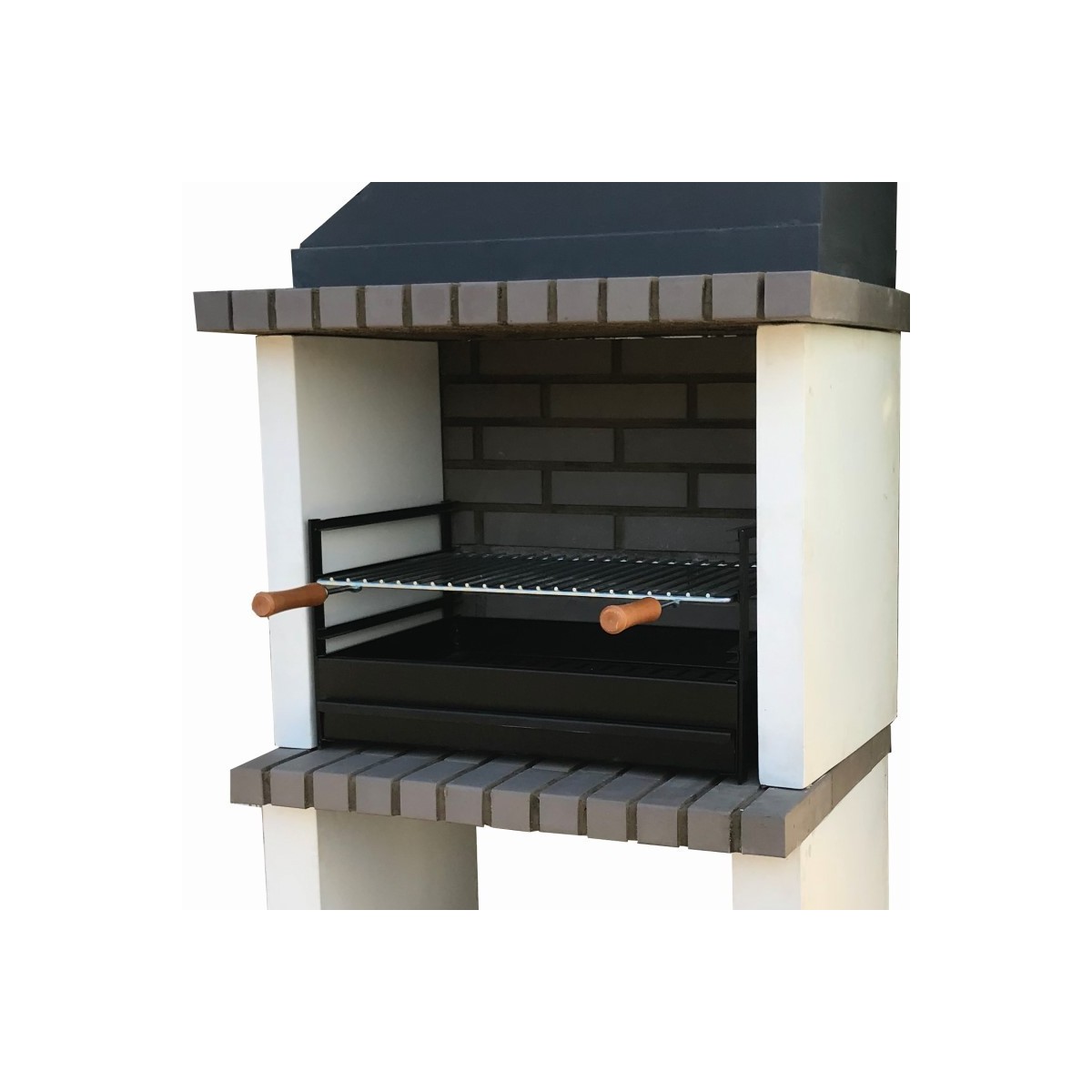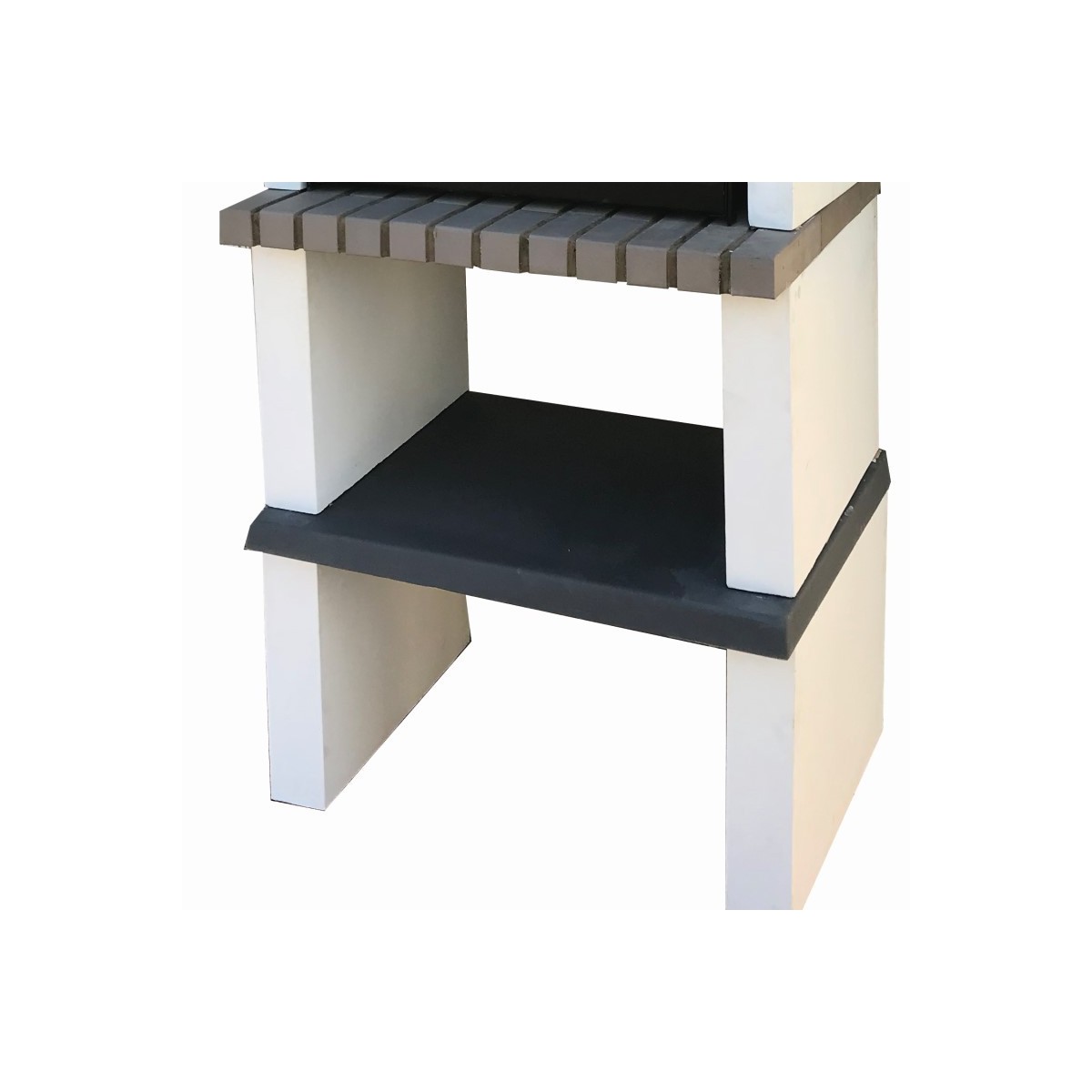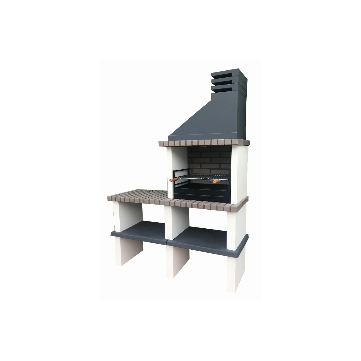 Barbacoa de obra Partner con bancada lateral, en ladrillo y hormigón refractario para uso de leña y carbón. Cuenta con campana,1 repisa inferior y una bancada lateral con repisa inferior.
