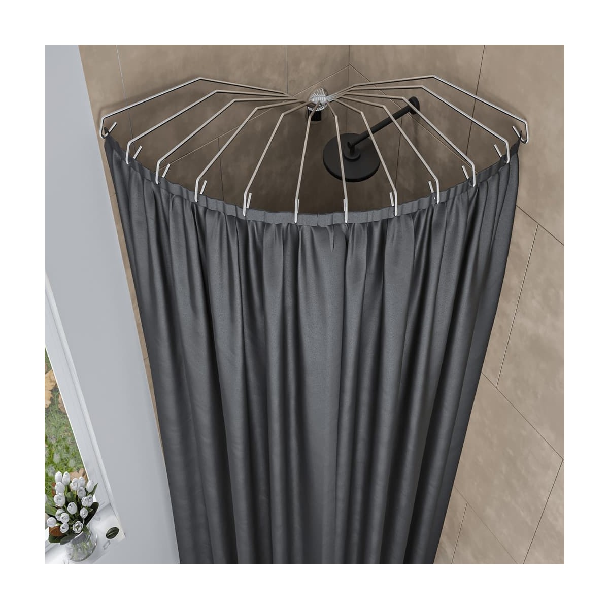 La barra de cortina de ducha Umbrella de Sealskin es la solución ideal para colgar una cortina de ducha cuando hay un baño con espacio limitado. De esta manera, podrás crear un cubículo de ducha en tu baño para poder disfrutar de una relajante ducha sin que todo tu baño se salpice. Pero incluso en una zona de ducha normal, el sistema colgante de cortinas de ducha cromadas es una buena alternativa a la barra de ducha clásica debido a su pequeña superficie: cuando no está en uso, simplemente se puede girar a un lado. Se incluyen los tornillos y tapones para un montaje seguro en la pared. Los 12 rieles incluidos aguantan una cortina de ducha con un ancho máximo de 155 cm.