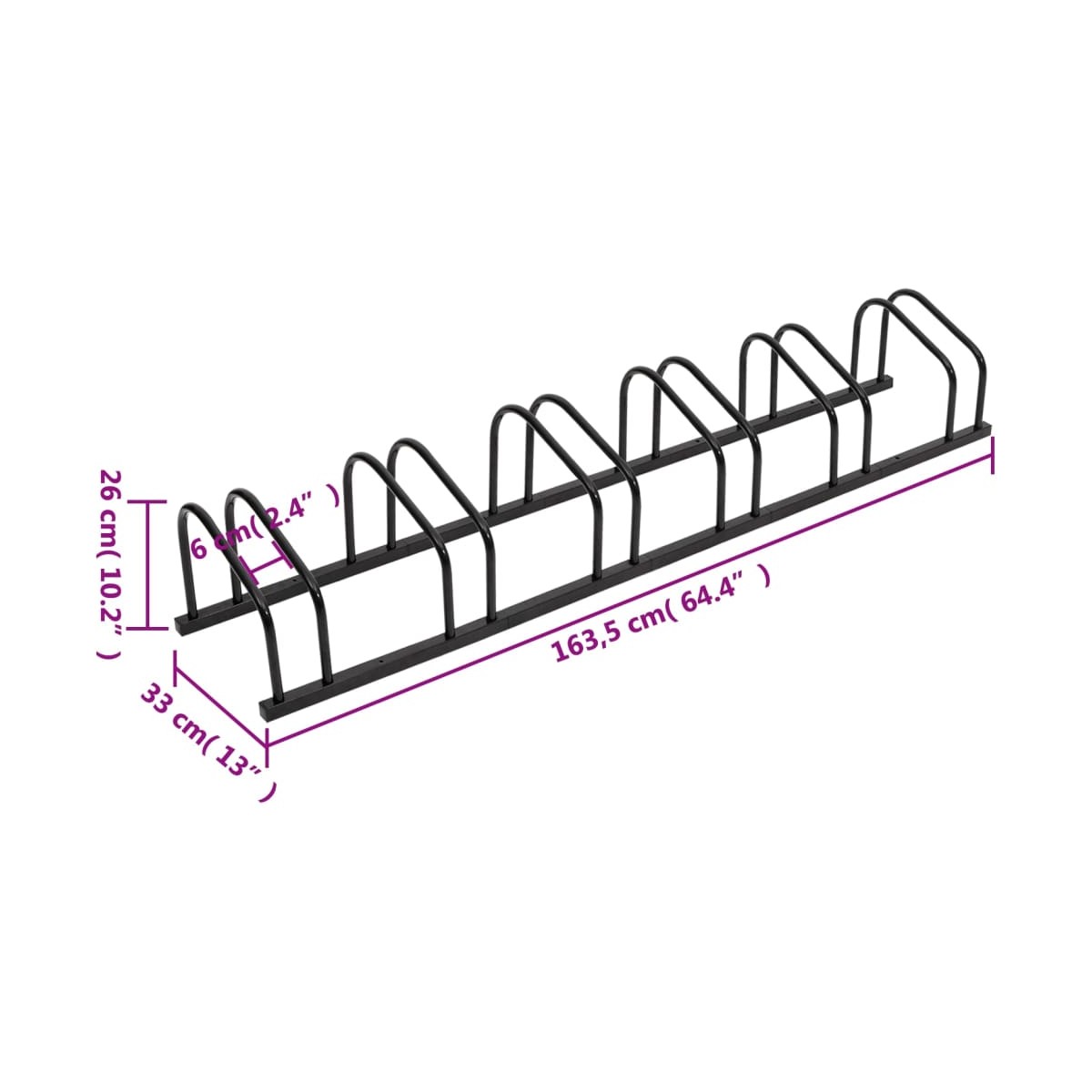 Este portabicicletas de acero proporciona una buena solución para guardar bicicletas para familias o pequeñas empresas. Material duradero: El acero es un material muy duro y fuerte. Ofrece solidez y estabilidad.Diseño práctico: El soporte para bicicletas está diseñado para que todas sus bicicletas se mantengan de pie y se mantengan organizadas en el piso. De esta manera, nunca verás un desastre en tu garaje. El diseño de estacionamiento en el suelo ahorra espacio para un lugar limitado y protege tu bicicleta desde cero.Amplia aplicación: Para la familia, poner el bicicletero en el garaje o jardín hace que el hogar esté organizado. Para una pequeña empresa, tenerlo y usar señalización para dirigir a los ciclistas a la zona designada para el estacionamiento de bicicletas es práctico y crea una buena imagen corporativa.Función antirrobo: Los tornillos y tacos se incluyen en la entrega para que este portabicicletas se pueda anclar al suelo y luego puedas bloquear la bicicleta y el portabicicletas para evitar robos.