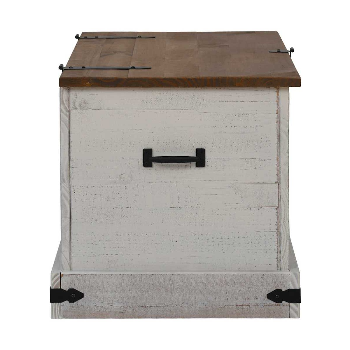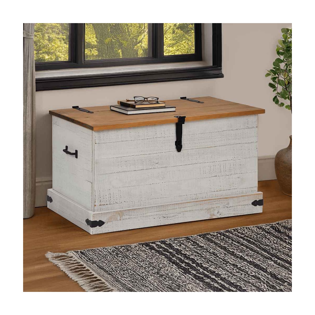 El arcón de almacenamiento de la gama HALDEN está diseñado para aportar funcionalidad y atractivo estético a su espacio vital. Material duradero: La madera maciza de pino es un bonito material natural conocido por su durabilidad y longevidad. Su veta recta contribuye a su atractivo, mientras que los nudos le confieren ese distintivo aspecto rústico.Amplio espacio de almacenamiento: el baúl de almacenamiento ofrece un amplio espacio para mantener su ropa, mantas, juguetes, cojines y otros elementos esenciales diarios bien organizados.Manijas de metal: Para mejorar su durabilidad, el baúl de almacenamiento está equipado con manijas de metal que no solo facilitan su movimiento sino que también le añaden belleza adicional.Amplias aplicaciones: con una parte superior estable, el cofre de almacenamiento proporciona una superficie segura para bocadillos, bebidas, jarrones, fruteros u otros artículos decorativos y también puede servir como mesa de café o mesa auxiliar.