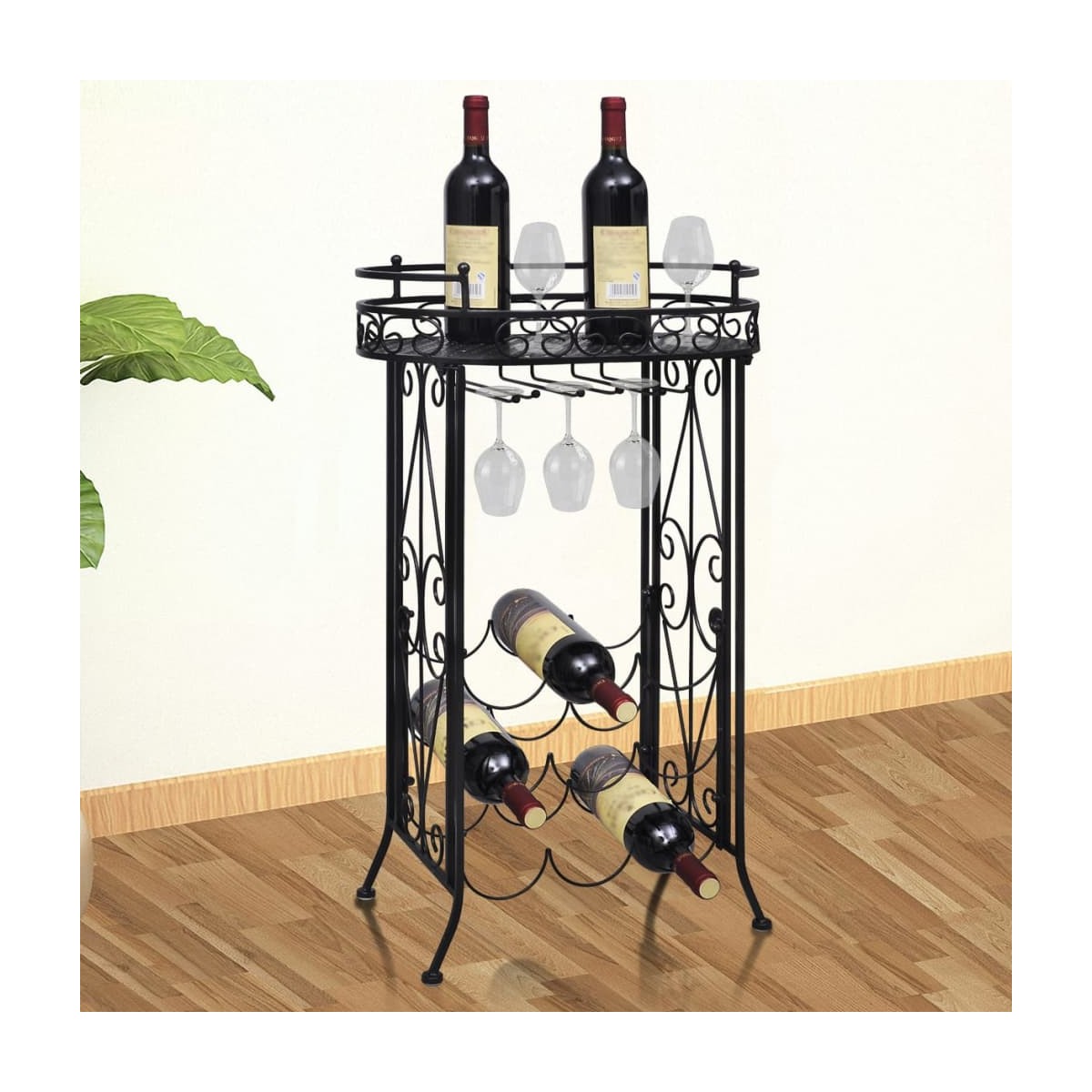 Este botellero es un verdadero atractivo dondequiera que se coloque. Hecho de hierro forjado, este botellero tiene un completo recubrimiento en polvo para que no se oxide ¡durará por generaciones! Este botellero tiene 9 posiciones para colocar botellas. Tiene una bandeja con raíles, y también sirve como una mesa. Varios ganchos debajo de la mesa le permiten colgar copas de vino. Por lo tanto, este botellero será un aporte perfecto cerca de su mesa de comedor. Su estilo clásico y elegante aporta un estilo romántico. También será un gran regalo para amigos o conocidos que sean amantes del vino. ¡Trae este elegante estante para vinos a casa y disfruta de la vida con él! Advertencia: Para evitar que se vuelque, este producto debe usarse con el dispositivo de fijación a la pared provisto.