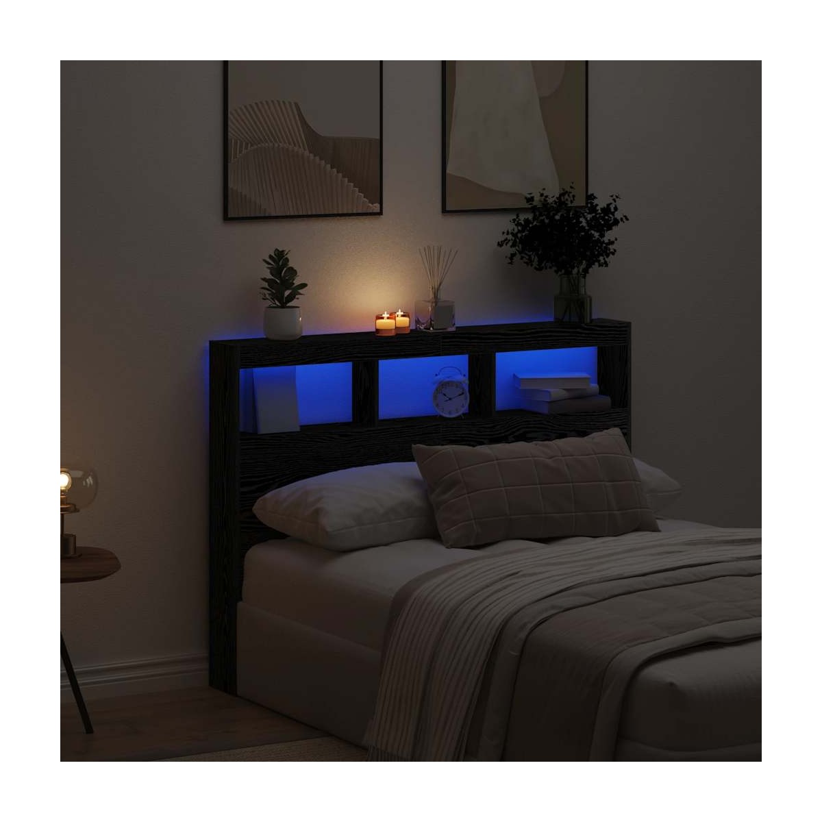 Este cabecero con luz LED, con un diseño elegante, le dará a tu cama un toque moderno y se adapta perfectamente a cualquier dormitorio. Material duradero: La madera de ingeniería tiene una calidad excepcional, con una superficie lisa y también cuenta con fuerza, estabilidad y resistencia a la humedad.Luces LED RGB: El cabecero está equipado con vibrantes luces LED RGB. Con diversos menús personalizables, puedes cambiar el color de las luces sin esfuerzo e incluso hacer que se regulen automáticamente. Estas luces LED no sólo realzan el aspecto contemporáneo del cabecero, sino que también le dan un toque a la moda.Amplio espacio de almacenamiento: Con compartimentos y una tapa resistente, el cabecero de la cama es perfecto para exhibir tus libros, artículos decorativos, marcos de fotos y despertadores.Excelente soporte: El cabecero de cama te ofrece un excelente soporte para la espalda cuando te sientas en la cama para leer o mirar la televisión. Información útil:La entrega incluye sólo el cabecero con LED. La estructura de cama y el colchón no están incluidos. Puedes consultar en nuestra tienda las estructuras y colchones a juego.El producto tiene un conector USB que necesita una fuente de alimentación USB certificada de 5 V (no incluida). Advertencia:Para evitar que vuelque, este producto debe usarse con el dispositivo de fijación a la pared suministrado.