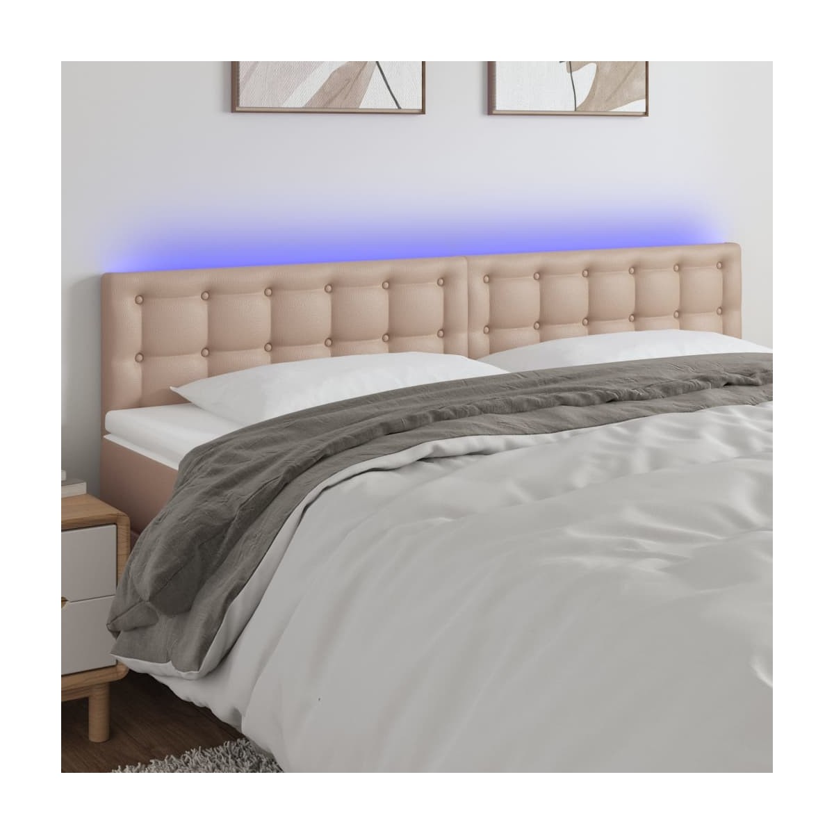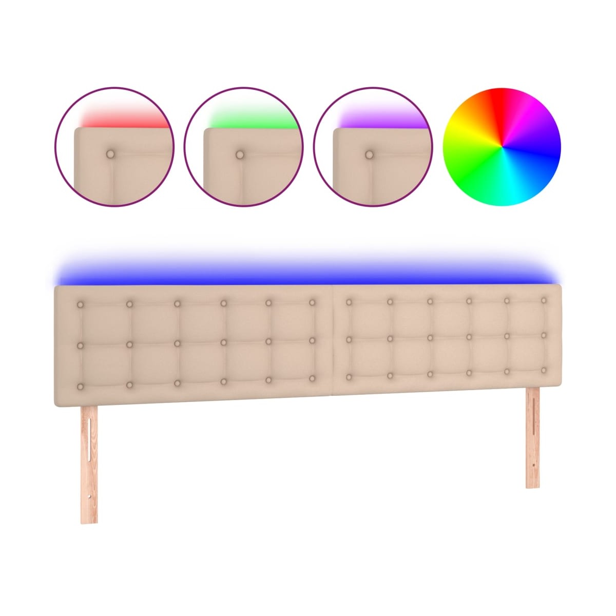 Este clásico cabecero con LED , con un diseño elegante, da a la estructura de tu cama un impresionante toque moderno y se adapta perfectamente a cualquier dormitorio. Material duradero: El cuero sintético de primera calidad es un material muy duradero. Es resistente a las manchas, por lo que es fácil de limpiar con un paño húmedo. Además, la superficie lisa da un aspecto lujoso y la belleza del cuero auténtico.LED de colores: Alegra la oscuridad con luces LED de colores.Altura regulable: El cabecero de la cama es ajustable en altura según tus preferencias.Excelente apoyo: El cabecero de la cama te proporciona un excelente apoyo para la espalda mientras estás sentado en la cama para leer o ver la televisión.Tira LED recortable: Puedes ajustar la longitud de esta tira LED flexible. El símbolo de las tijeras indica dónde se puede cortar la tira sin dañarla. Nota: La lona impermeable no está incluidaÚnicamente puedes cortar por la parte con el símbolo de las tijeras y únicamente la parte con el USB seguirá funcionando como antes.Cada producto viene con un manual de montaje en la caja para facilitar el montaje.El producto tiene un conector USB, pero no se incluye la fuente de alimentación USB de 5 V certificada.