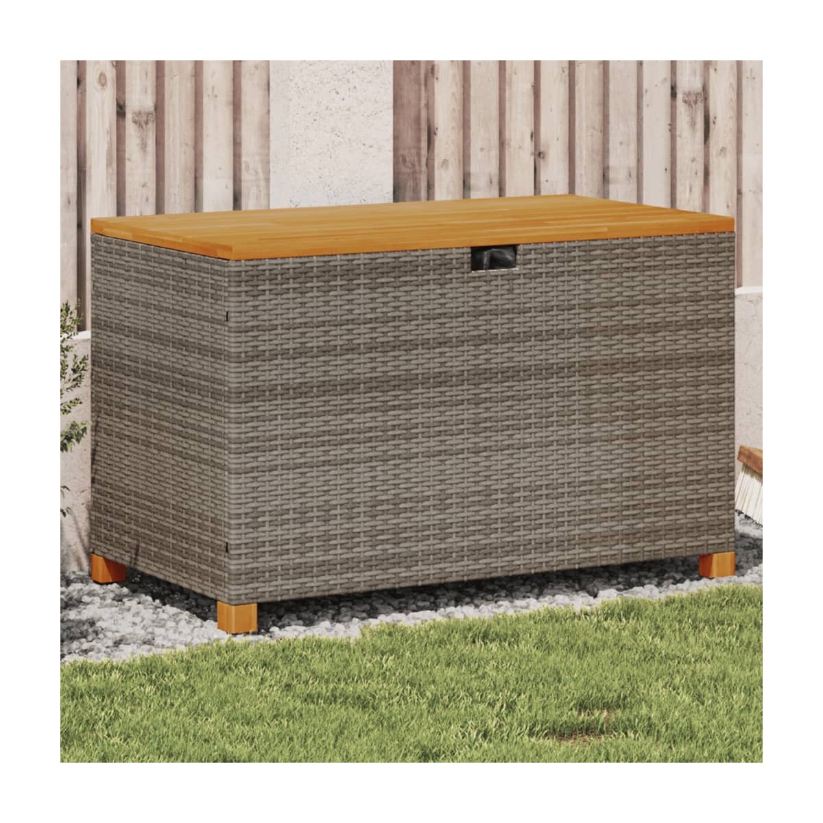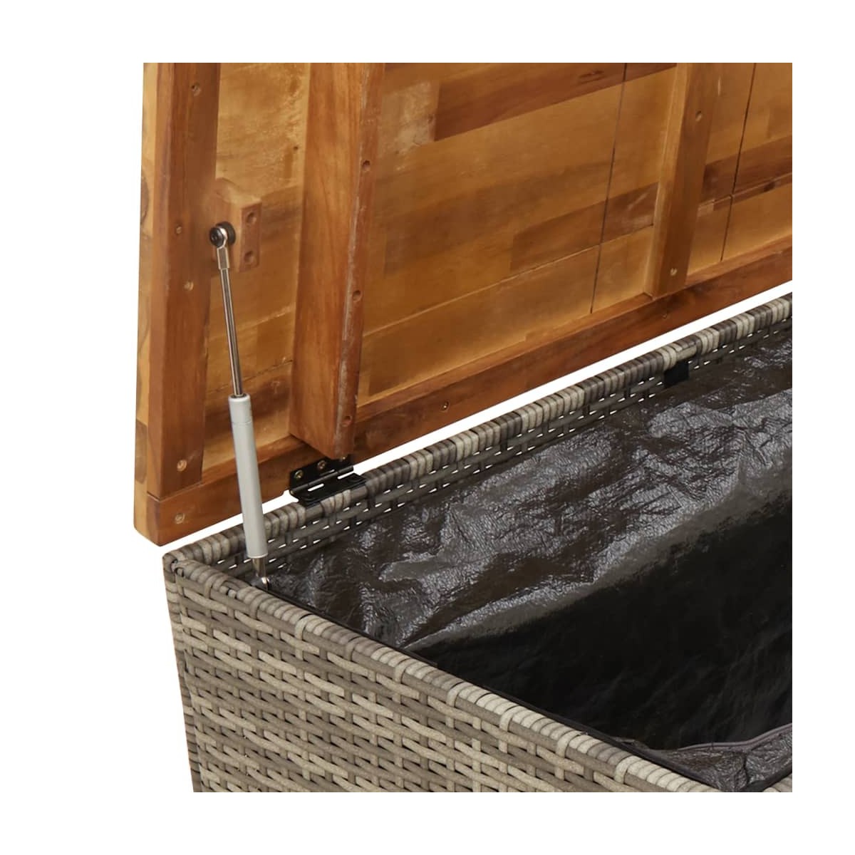 Esta caja de almacenaje de jardín es ideal para guardar cojines, almohadas, mantas, juguetes y otros objetos en el jardín o el patio. Material duradero: El ratán PE, también conocido como ratán sintético, es un material sintético resistente y de bajo mantenimiento que se parece al ratán natural. Es ligero, fácil de limpiar y se usa comúnmente para muebles de exterior debido a su durabilidad y propiedades resistentes a la intemperie.Función de almacenamiento con bolsa resistente al agua: El mueble de jardín cuenta con espacio de almacenamiento debajo del asiento, completo con una bolsa resistente al agua para guardar cojines, juguetes y otros artículos. La bolsa interior se puede sujetar de forma segura a los muebles de exterior con cierres de gancho y bucle para mayor estabilidad.Uso versátil: Este mueble de exterior cumple una doble función como caja de almacenaje de jardín y como asiento de banco.Seguro y fácil de abrir y cerrar: El resorte de gas facilita la apertura de la tapa y evita que se cierre de golpe o atrape los dedos.Superficie estable y fácil de limpiar: Este mueble de patio tiene una superficie de madera de acacia que es resistente, duradero y fácil de limpiar con un paño húmedo. Información útil:Para asegurarte de que tus muebles de exterior se mantengan hermosos, recomendamos protegerlos con una funda impermeable.