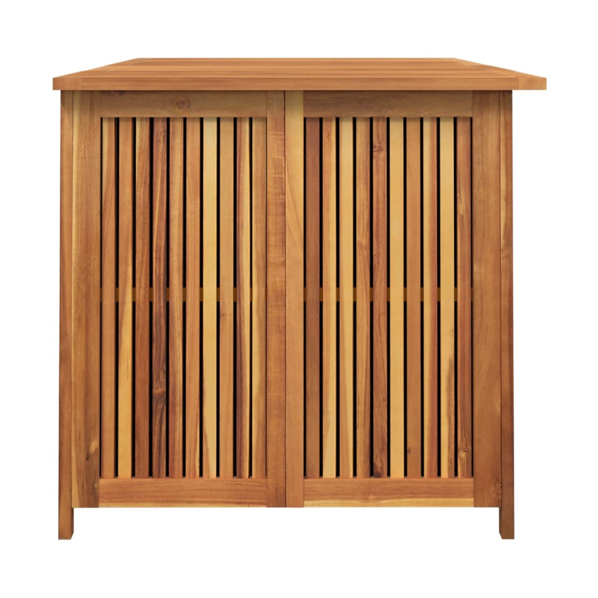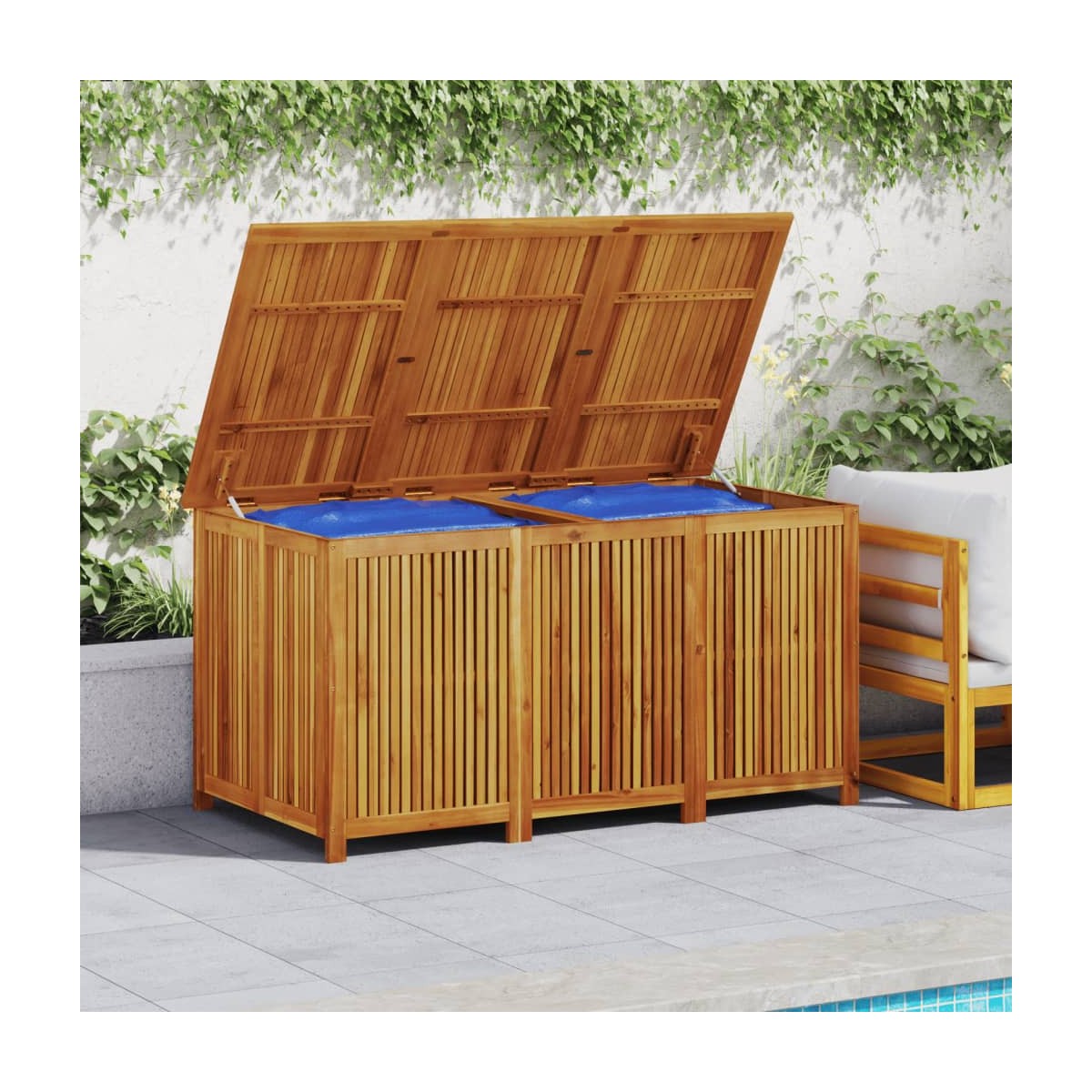 Esta caja de almacenamiento de madera para el jardín ofrece un amplio espacio de almacenamiento para los cojines de los muebles de jardín, los juguetes, las herramientas de jardinería y cualquier otra cosa que te guste tener al alcance de la mano en el espacio exterior. También puede utilizarse en interiores. Madera maciza de acacia: La caja de almacenaje de madera está hecha de madera maciza de acacia. La madera maciza de acacia es un bonito material natural, denso, robusto y duradero.Amplio espacio de almacenaje: El amplio espacio de almacenaje permite tener las cosas organizadas. Sirve para guardar cojines, almohaas, mantas, juguetes, etc.Bolsa resistente al agua: La bolsa resistente al agua protege tus artículos de la humedad. Información útil:Para asegurarte de que tus muebles de exterior se mantengan hermosos, recomendamos protegerlos con una funda impermeable.