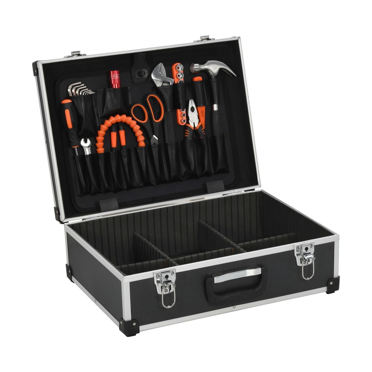 ¡Mantenga todas sus herramientas ordenadas con este maletín de herramientas con textura de aluminio! Hecho de madera, láminas de ABS y aluminio, esta caja de herramientas es resistente al agua y duradera. Viene con el recorte de aluminio reforzado para mayor resistencia. Esta caja de herramientas de aluminio consta de 6 compartimentos y 17 bolsillos, lo que le brinda un amplio espacio para mantener bien organizadas todas las herramientas, como destornilladores, alicates y llaves. Esta caja de herramientas se puede cerrar con llave incluida para un almacenamiento seguro. Su práctica asa incorporada le permite transportar todas las herramientas fácilmente. ¡Almacene y transporte sus herramientas fácilmente con nuestros estuches de almacenamiento portátiles!
