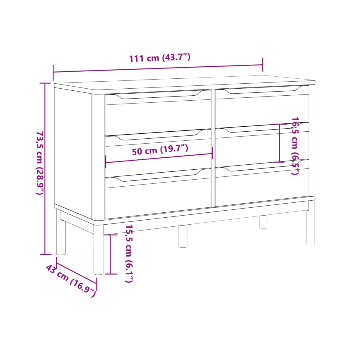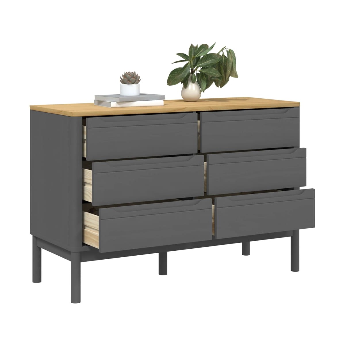 Esta clásica cómoda, con un aspecto atemporal, está destinada a ser un excelente complemento para la casa. Madera maciza de pino: La madera maciza de pino es un bonito material natural. La madera de pino tiene vetas rectas, y los nudos dan al material su distintivo aspecto rústico. Hecho de madera maciza de pino, el armario es duradero y resistente.Amplio espacio de almacenaje: El mueble de almacenaje con 6 cajones ofrece un amplio espacio de almacenaje para mantener tus cosas bien organizadas y al alcance.Función de exhibición: La superficie del mueble aparador va genial para colocar objetos decorativos, álbumes de fotos o pequeñas plantas.Patas de madera: Las patas de madera le dan al armario un aspecto natural y agradable a la vez que garantizan la estabilidad. Combina bien con cualquier decoración de interior. Advertencia:Para evitar que vuelque, este producto debe usarse con el dispositivo de fijación a la pared (no incluido).