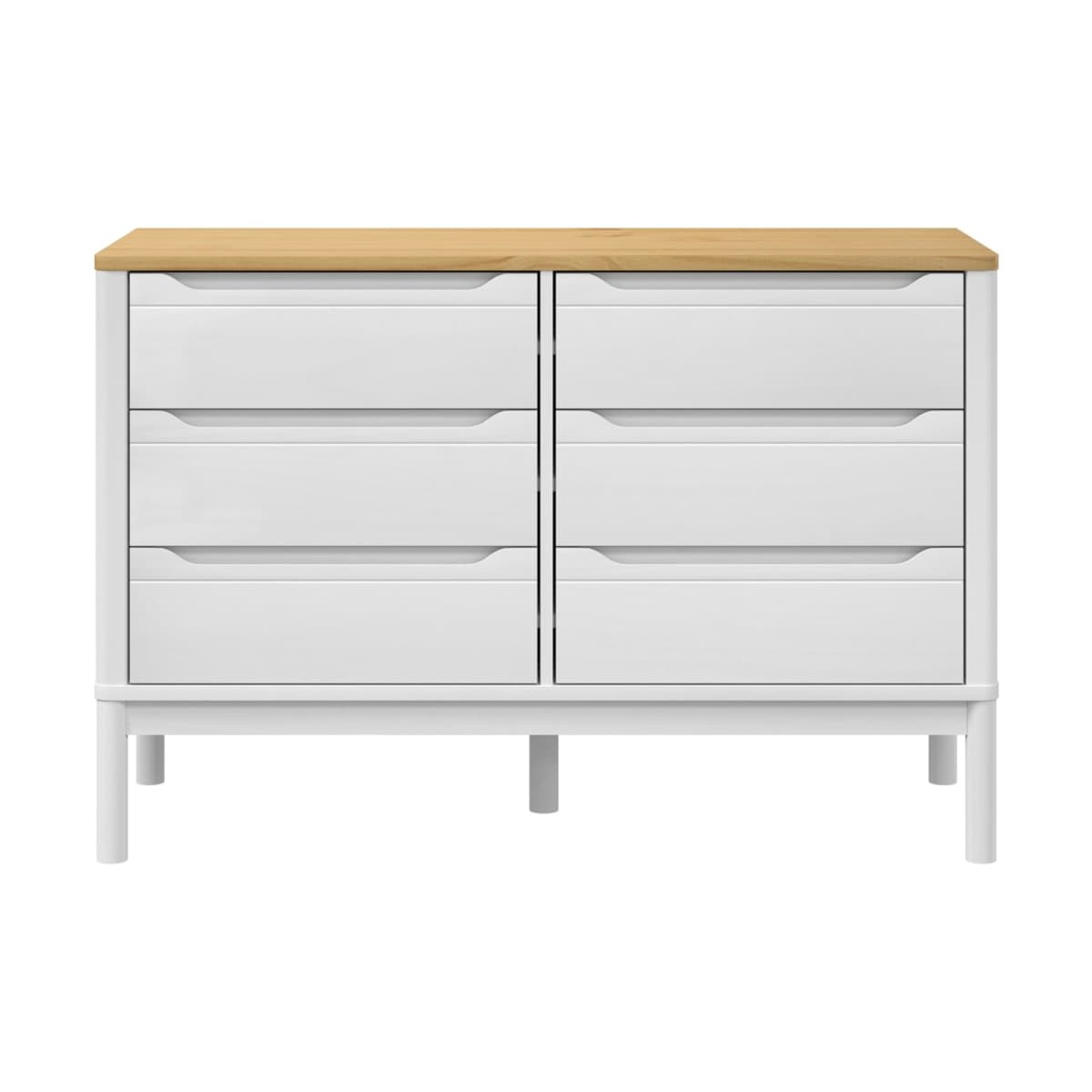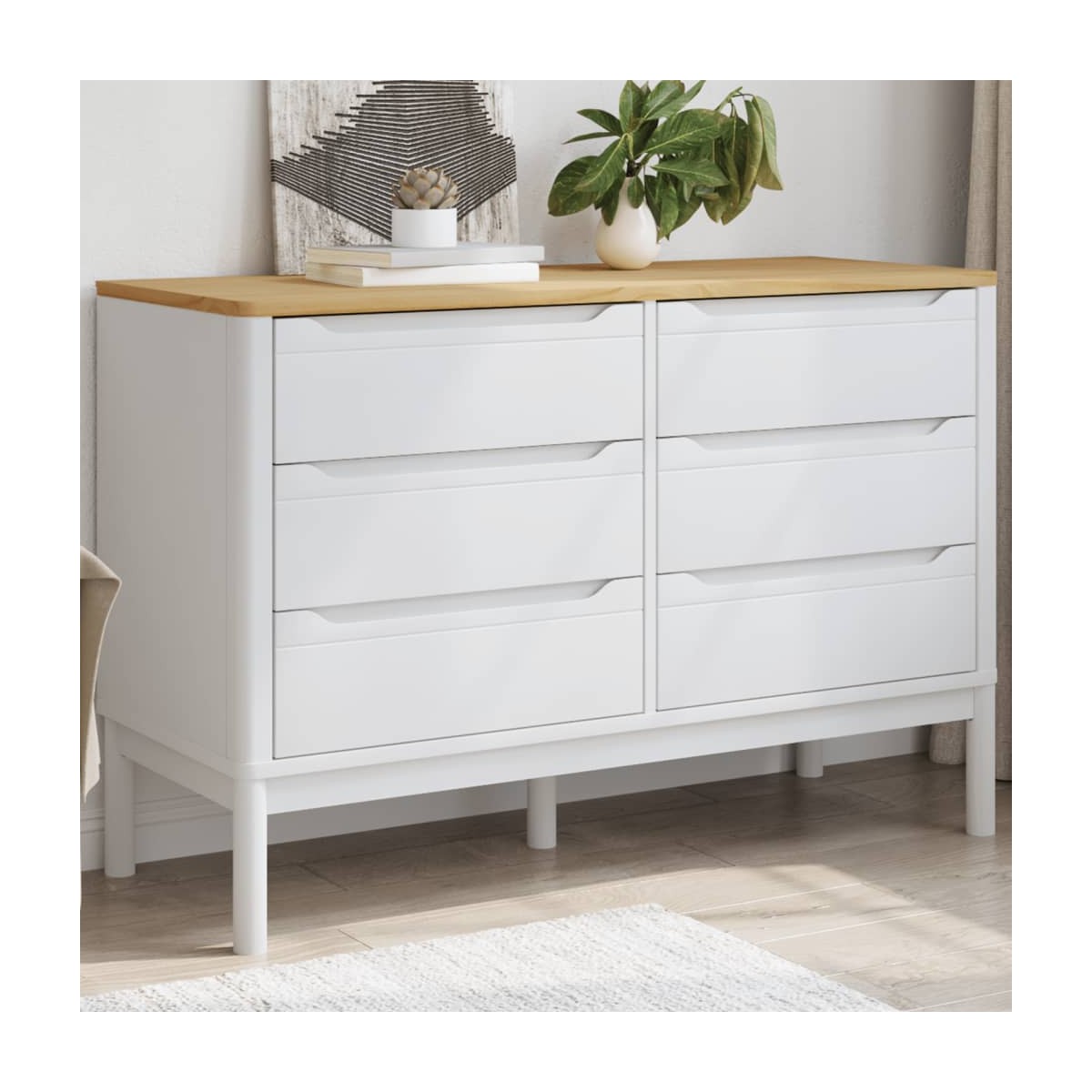Esta clásica cómoda, con un aspecto atemporal, está destinada a ser un excelente complemento para la casa. Madera maciza de pino: La madera maciza de pino es un bonito material natural. La madera de pino tiene vetas rectas, y los nudos dan al material su distintivo aspecto rústico. Hecho de madera maciza de pino, el armario es duradero y resistente.Amplio espacio de almacenaje: El mueble de almacenaje con 6 cajones ofrece un amplio espacio de almacenaje para mantener tus cosas bien organizadas y al alcance.Función de exhibición: La superficie del mueble aparador va genial para colocar objetos decorativos, álbumes de fotos o pequeñas plantas.Patas de madera: Las patas de madera le dan al armario un aspecto natural y agradable a la vez que garantizan la estabilidad. Combina bien con cualquier decoración de interior. Advertencia:Para evitar que vuelque, este producto debe usarse con el dispositivo de fijación a la pared (no incluido).