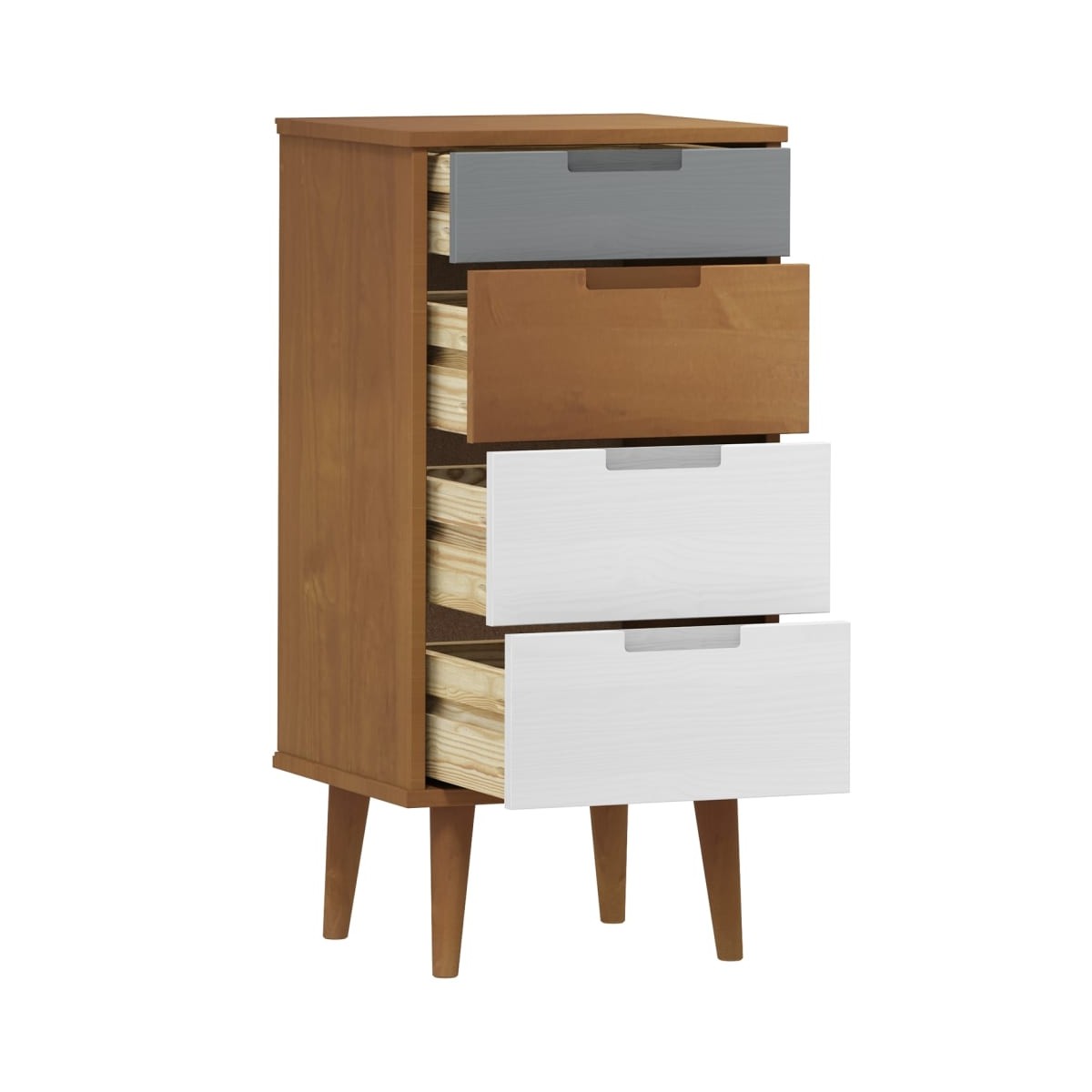 Esta clásica cómoda de madera es una opción perfecta si estás buscando dar un estilo escandinavo a la decoración de tu casa. Madera de pino maciza: La madera de pino maciza es un bonito material natural. La madera de pino tiene vetas rectas, y los nudos dan al material su distintivo aspecto rústico.Barniz UV: El barniz UV es un tipo especial de barniz que se acaba con una máquina de secado ultravioleta. Crea un acabado más vívido, más lujoso y más táctil en comparación con los barnices que no son UV.Amplio espacio de almacenaje: El mueble de almacenaje tiene 4 cajones. Los espaciosos cajones te permiten tener las cosas organizadas.Robusta superficie: La resistente superficie es perfecta para colocar plantas, fotos enmarcadas y otros objetos decorativos.Armario versátil: La cómoda también puede servir como mesita de noche, por lo que es una opción perfecta para la casa. Advertencia:Para evitar el vuelco, este producto debe usarse con el dispositivo provisto para fijarlo a la pared. Nota:Cada producto viene con un manual de montaje en la caja para facilitar el montaje.