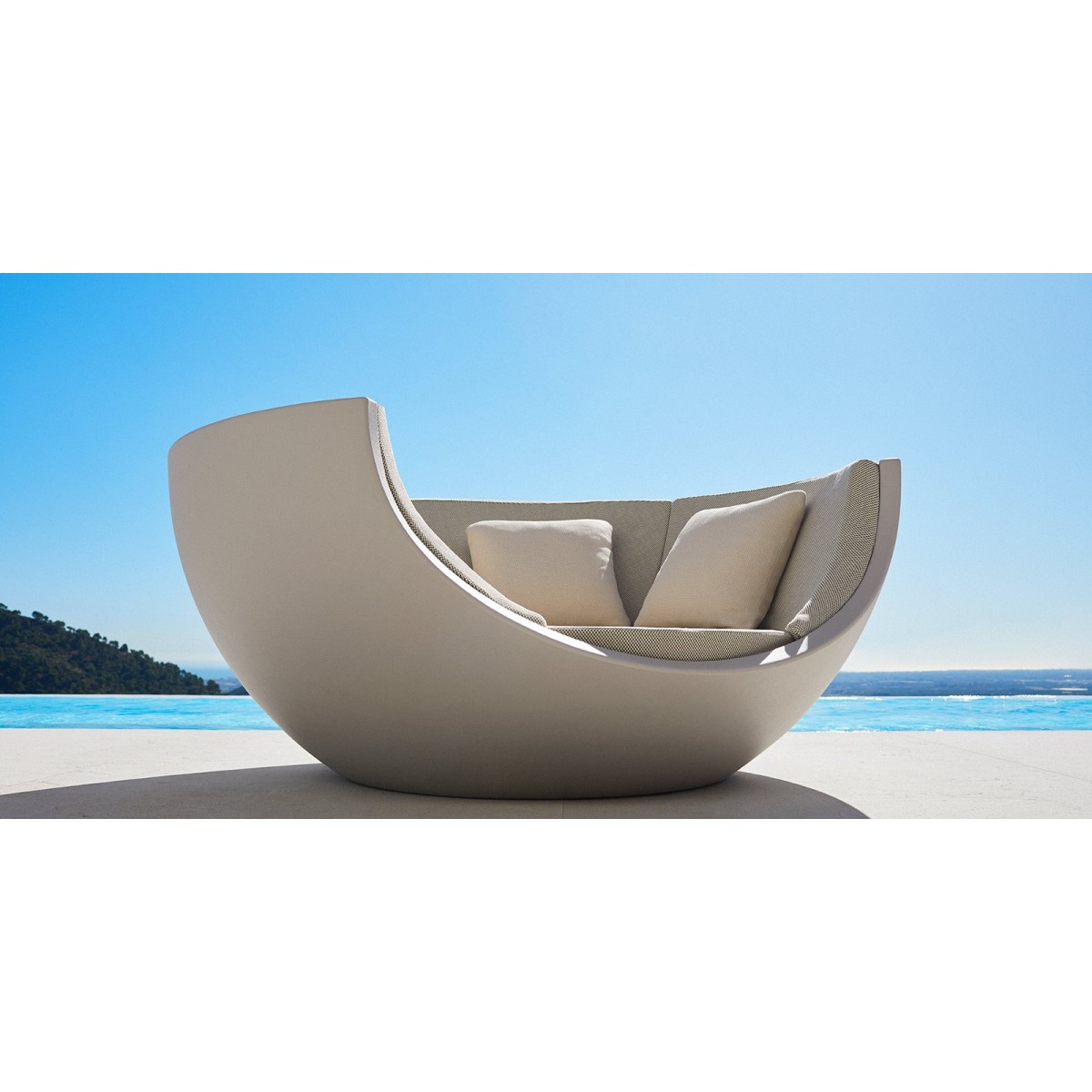 Diseñada por Ramón Esteve para Vondom, la principal característica de la Daybeed Moon es su forma circular y el sistema giratorio sobre el que descansa su base, que permite rotar la pieza sobre su propio eje.