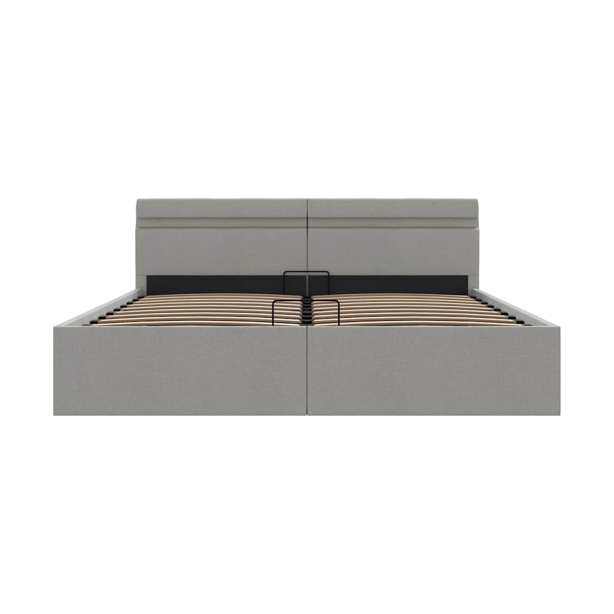 ¡Añade al instante un impresionante toque moderno a tu dormitorio con nuestra estructura de cama hidráulica de tela! Esta cama de matrimonio se caracteriza por un diseño sencillo pero elegante, así como una estructura maciza ya que está hecha de MDF resistente y robusto. Esta cama tapizada convierte el espacio no utilizado debajo del colchón en espacio de almacenamiento, con un amplio espacio para guardar ropa, sábanas, mantas, etc. El mecanismo hidráulico de elevación de gas hace que levantar el colchón sea muy fácil. El somier permanecerá en posición vertical una vez que lo hayas levantado para que tengas ambas manos libres para retirar o guardar objetos debajo. La estructura de acero con recubrimiento en polvo y los listones de madera contrachapada aportan solidez y durabilidad a la cama. Tapizada con tela duradera, esta cama con almacenaje tiene un aspecto acogedor y es fácil de mantener. Este producto es fácil de montar. Este mueble para el dormitorio es adecuado para un colchón de 160 x 200 cm. Asimismo, puedes ajustar cómodamente la potencia, el brillo y los diferentes colores intermitentes de la tira de luz LED con el mando a distancia de 24 teclas incluido para crear un espectáculo de luces alucinante. Ten en cuenta que la entrega solo incluye la estructura de cama; el colchón no está incluido. Puedes buscar uno apropiado para ella en nuestra tienda. Nota: El producto tiene un conector USB, pero la fuente de alimentación USB de 5V certificada no está incluida.
