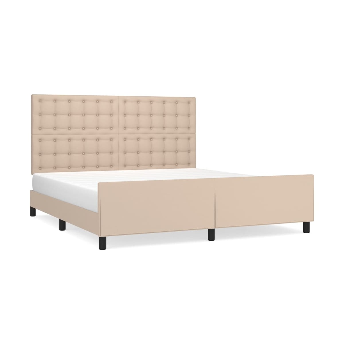 ¡Consigue un sueño más reparador con esta estructura de cama con cabecero! Es un aporte acogedor para cualquier dormitorio. Material duradero: El cuero sintético de primera calidad es un material muy duradero. Es resistente a las manchas, por lo que es fácil de limpiar con un paño húmedo. Además, la superficie lisa da un aspecto lujoso y la belleza del cuero auténtico.Altura regulable: El cabecero de la cama es ajustable en altura según tus preferencias.Patas de apoyo: La cama se apoya en patas robustas, que garantizan su estabilidad, seguridad y firmeza.Listones robustos: Los listones de madera contrachapada proporcionan una buena distribución del peso, lo que garantiza que el colchón se mantenga en tu sitio con cada giro y vuelta del cuerpo mientras duermes.Excelente apoyo: El cabecero de la cama te proporciona un excelente apoyo para la espalda mientras estás sentado en la cama para leer o ver la televisión. Nota:La entrega incluye solo una estructura de cama. El colchón no está incluido. Puedes echar un vistazo en nuestra tienda para buscar colchones a juego.Cada producto viene con un manual de montaje en la caja para facilitar el montaje.