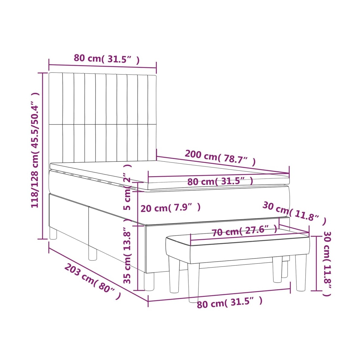 - Dimensiones: 203 x 80 x 118/128 cm (largo x ancho x alto)