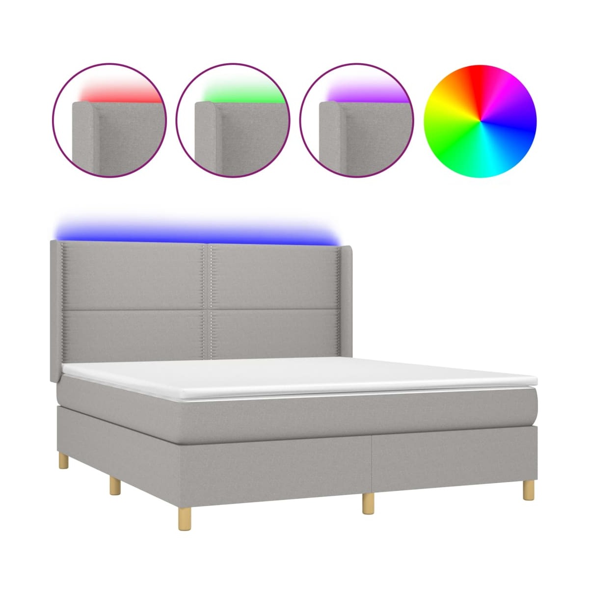 Utiliza esta cama tipo box spring con colchón y luces LED para disfrutar de un sueño reparador. Será el centro de atención del dormitorio. Material de primera calidad: La tela posee un aspecto sencillo y limpio, y es transpirable y duradera.Cabecero práctico: El cabecero de la cama es ajustable en altura según tus preferencias. El cabecero de la cama te proporciona un excelente apoyo para la espalda mientras estás sentado en la cama para leer o ver la televisión.Tira de LED de colores: Alegra la oscuridad con luces LED de colores.Colchón de muelles ensacados: El muelle ensacado individual incorporado es conocido por su altísima calidad, al tiempo que garantiza un alto nivel de durabilidad y adaptabilidad. Puede absorber eficazmente el ruido y los golpes causados por los lanzamientos y los giros.Protector de colchón respetuoso con la piel: El protector de colchón tiene una funda de tejido resistente y respetuoso con la piel, que lo hace suave y confortable. Nota:Por razones de higiene, el colchón no puede devolverse si se ha quitado o abierto el embalaje.Únicamente puedes cortar por la parte con el símbolo de las tijeras y únicamente la parte con el USB seguirá funcionando como antes.Cada producto viene con un manual de montaje en la caja para facilitar el montaje.El producto tiene un conector USB, pero no se incluye la fuente de alimentación USB de 5 V certificada.