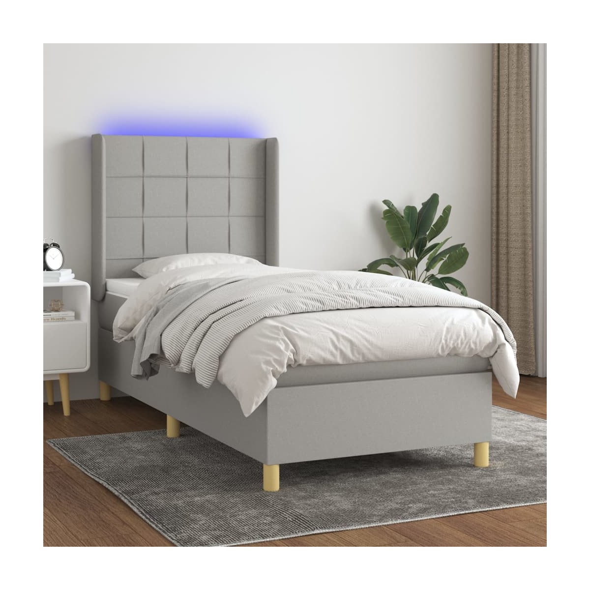 Utiliza esta cama tipo box spring con colchón y luces LED para disfrutar de un sueño reparador. Será el centro de atención del dormitorio. Material de primera calidad: La tela posee un aspecto sencillo y limpio, y es transpirable y duradera.Cabecero práctico: El cabecero de la cama es ajustable en altura según tus preferencias. El cabecero de la cama te proporciona un excelente apoyo para la espalda mientras estás sentado en la cama para leer o ver la televisión.Tira de LED de colores: Alegra la oscuridad con luces LED de colores.Colchón de muelles ensacados: El muelle ensacado individual incorporado es conocido por su altísima calidad, al tiempo que garantiza un alto nivel de durabilidad y adaptabilidad. Puede absorber eficazmente el ruido y los golpes causados por los lanzamientos y los giros.Protector de colchón respetuoso con la piel: El protector de colchón tiene una funda de tejido resistente y respetuoso con la piel, que lo hace suave y confortable. Nota:Por razones de higiene, el colchón no puede devolverse si se ha quitado o abierto el embalaje.Únicamente puedes cortar por la parte con el símbolo de las tijeras y únicamente la parte con el USB seguirá funcionando como antes.Cada producto viene con un manual de montaje en la caja para facilitar el montaje.El producto tiene un conector USB, pero no se incluye la fuente de alimentación USB de 5 V certificada.