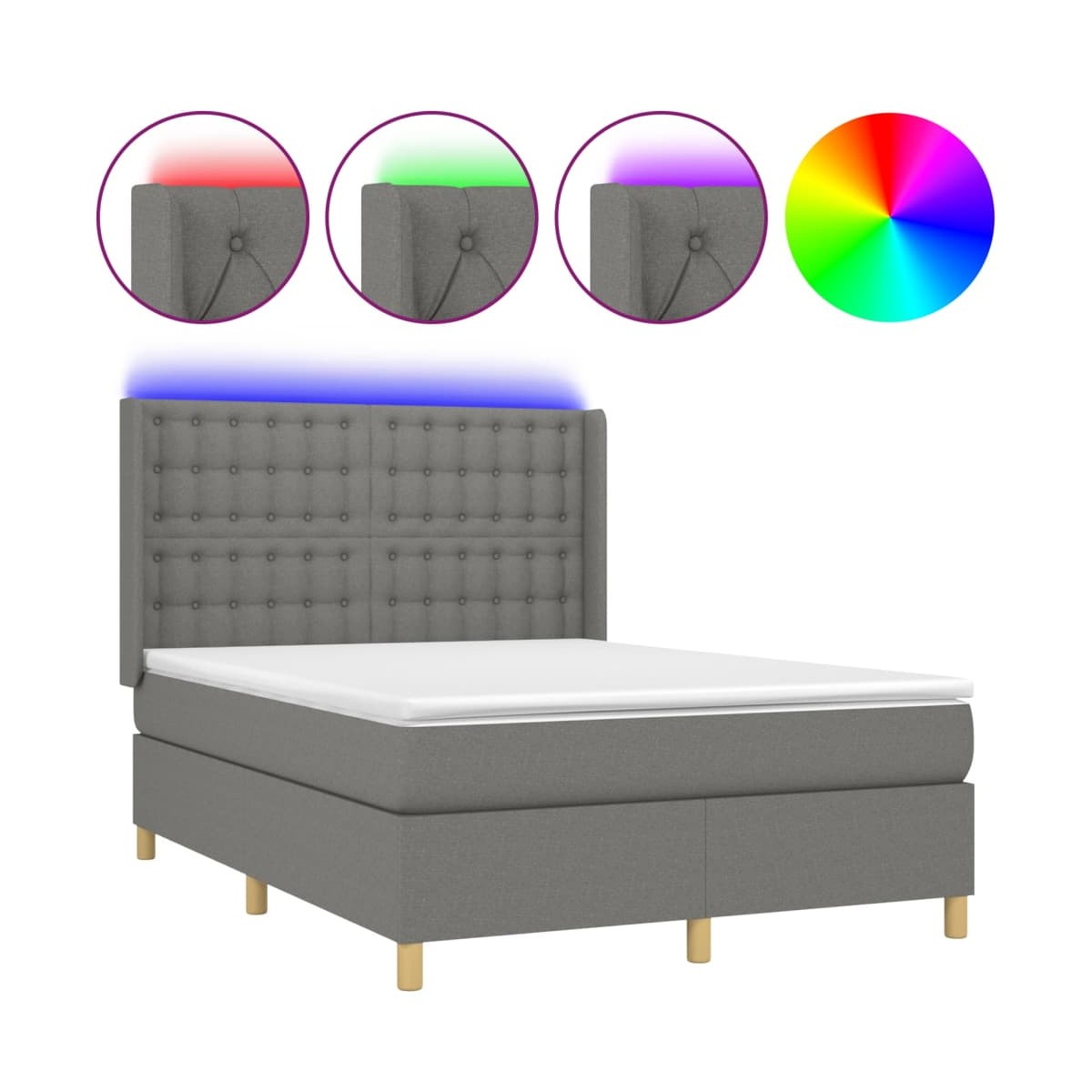 Utiliza esta cama tipo box spring con colchón y luces LED para disfrutar de un sueño reparador. Será el centro de atención del dormitorio. Material de primera calidad: La tela posee un aspecto sencillo y limpio, y es transpirable y duradera.Cabecero práctico: El cabecero de la cama es ajustable en altura según tus preferencias. El cabecero de la cama te proporciona un excelente apoyo para la espalda mientras estás sentado en la cama para leer o ver la televisión.Tira de LED de colores: Alegra la oscuridad con luces LED de colores.Colchón de muelles ensacados: El muelle ensacado individual incorporado es conocido por su altísima calidad, al tiempo que garantiza un alto nivel de durabilidad y adaptabilidad. Puede absorber eficazmente el ruido y los golpes causados por los lanzamientos y los giros.Protector de colchón respetuoso con la piel: El protector de colchón tiene una funda de tejido resistente y respetuoso con la piel, que lo hace suave y confortable. Nota:Por razones de higiene, el colchón no puede devolverse si se ha quitado o abierto el embalaje.Únicamente puedes cortar por la parte con el símbolo de las tijeras y únicamente la parte con el USB seguirá funcionando como antes.Cada producto viene con un manual de montaje en la caja para facilitar el montaje.El producto tiene un conector USB, pero no se incluye la fuente de alimentación USB de 5 V certificada.