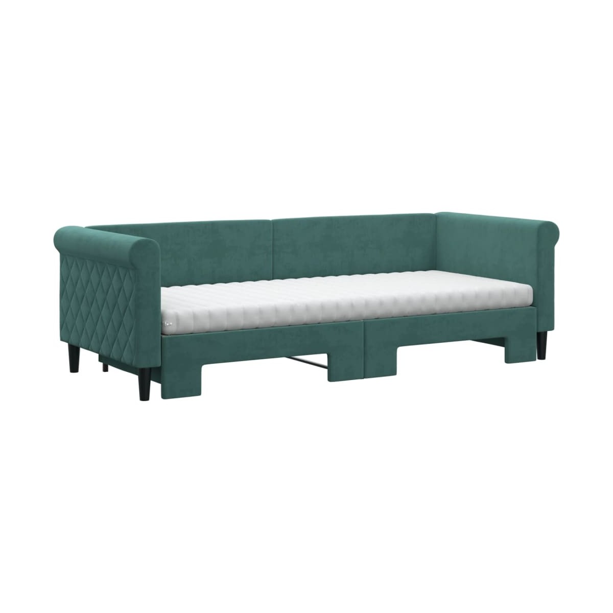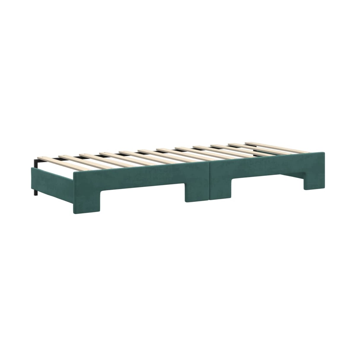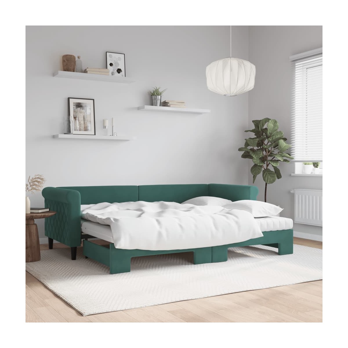 Este sofá cama 2 en 1 con cama nido, que sirve como sofá y cama, es un complemento práctico y llamativo para tu salón o dormitorio. Sofá cama versátil: El sofá cama funciona como sofá durante el día y se convierte fácilmente en una cama doble por la noche sacando la cama nido, lo que proporciona una solución práctica para recibir invitados y maximizar el espacio.Cómodo colchón de espuma: Esta cama se suministra con dos colchones de espuma para un máximo apoyo y una comodidad óptima.Terciopelo suave y construcción sólida: Este sofá cama tiene una estructura resistente hecha de madera y metal y está tapizado en terciopelo suave y cómodo.Diseño moderno: ¡El sofá cama tiene un diseño moderno con líneas nítidas, un aspecto minimalista, así como luz natural, y añadirá un estilo moderno a la casa!