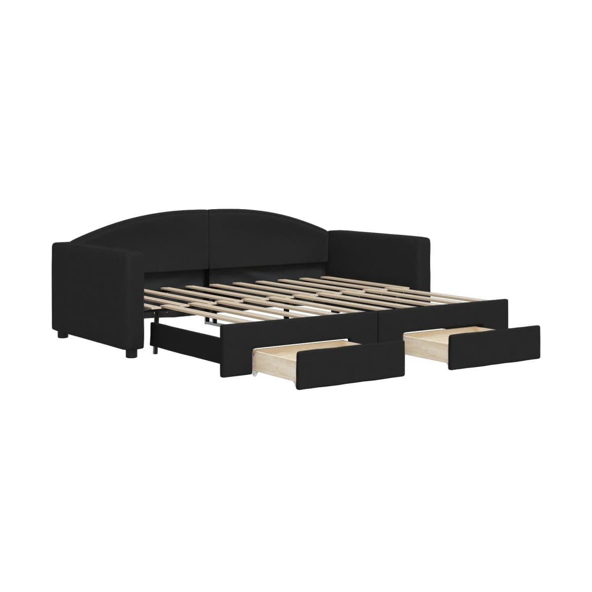 Este sofá cama 2 en 1 con cama nido, que sirve como sofá y cama, es un complemento práctico y llamativo para tu salón o dormitorio. Sofá cama versátil: El sofá cama funciona como sofá durante el día y se convierte fácilmente en una cama doble por la noche sacando la cama nido, lo que proporciona una solución práctica para recibir invitados y maximizar el espacio.Amplio espacio de almacenamiento: Esta cama de invitados tiene dos cajones con ruedas que brindan un amplio espacio para guardar ropa, calcetines, juguetes, cojines, etc.Tela duradera y construcción sólida: Este sofá cama tiene una estructura resistente hecha de madera y metal y está tapizado con una tela duradera y cómoda. Información útil:El colchón no está incluido con la cama. Ofrecemos una variada selección de colchones. Puedes echar un vistazo a nuestra tienda para buscar el correspondiente colchón.