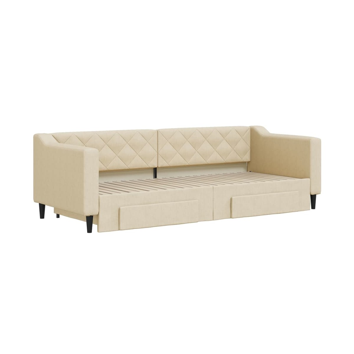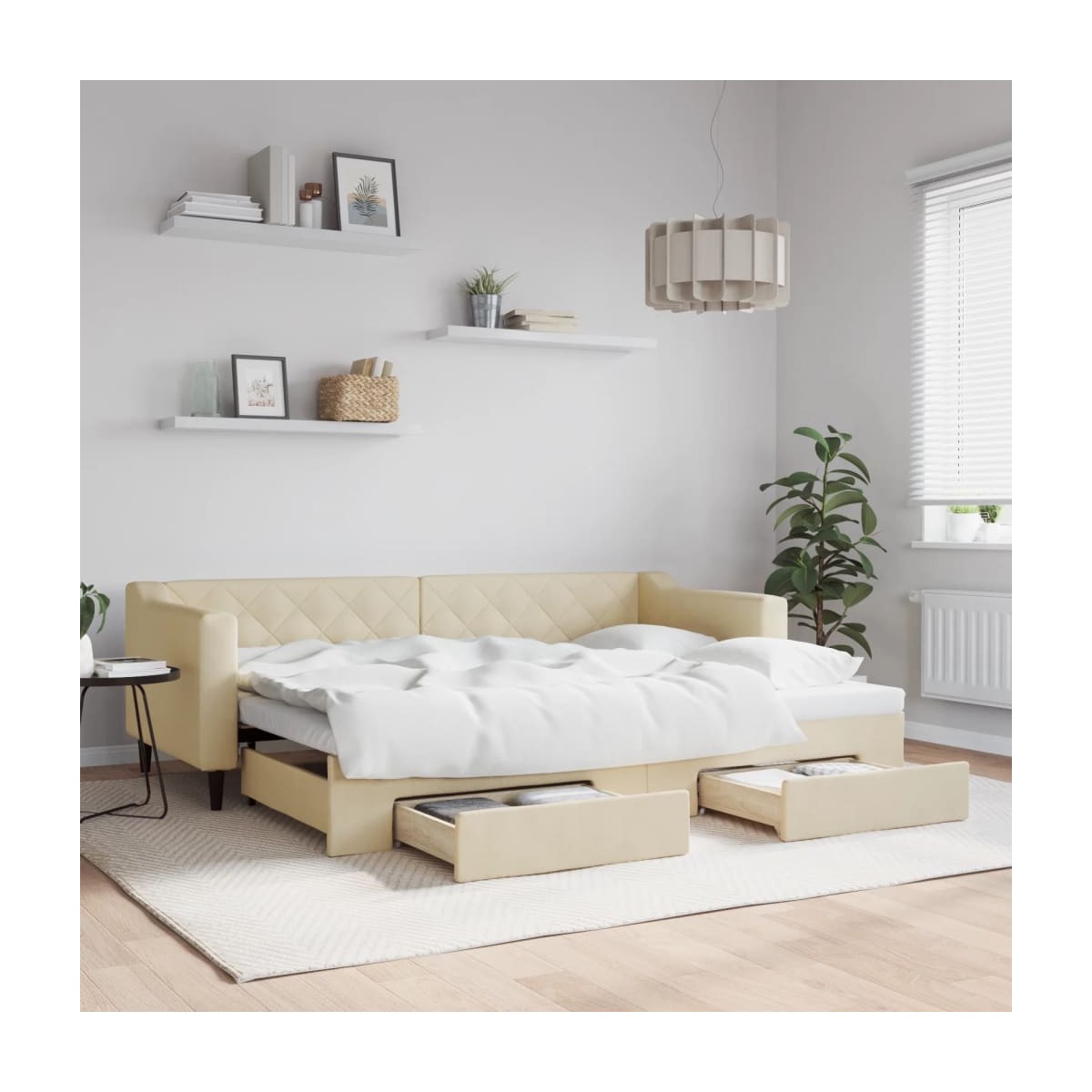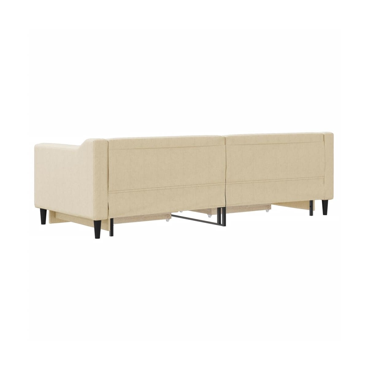 Este sofá cama 2 en 1 con cama nido, que sirve como sofá y cama, es un complemento práctico y llamativo para tu salón o dormitorio. Sofá cama versátil: El sofá cama funciona como sofá durante el día y se convierte fácilmente en una cama doble por la noche sacando la cama nido, lo que proporciona una solución práctica para recibir invitados y maximizar el espacio. Amplio espacio de almacenamiento: Esta cama de invitados tiene dos cajones con ruedas que brindan un amplio espacio para guardar ropa, calcetines, juguetes, cojines, etc. Tela duradera y construcción sólida: Este sofá cama tiene una estructura resistente hecha de madera y metal y está tapizado con una tela duradera y cómoda.Diseño moderno: ¡El sofá cama tiene un diseño moderno con líneas nítidas, un aspecto minimalista y añadirá un estilo moderno a la casa! Información útil:El colchón no está incluido con la cama. Ofrecemos una variada selección de colchones. Puedes echar un vistazo a nuestra tienda para buscar el correspondiente colchón.