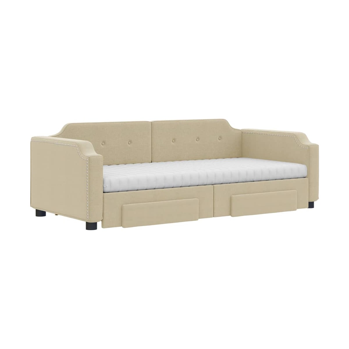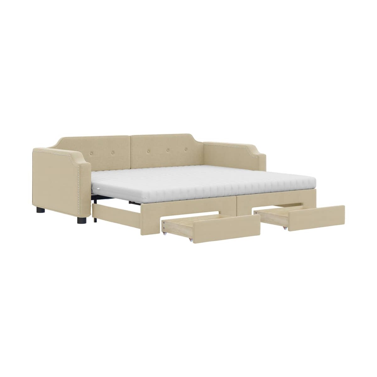 Este sofá cama 2 en 1 con cama nido, que sirve como sofá y cama, es un complemento práctico y llamativo para tu salón o dormitorio. Sofá cama versátil: El sofá cama funciona como sofá durante el día y se convierte fácilmente en una cama doble por la noche sacando la cama nido, lo que proporciona una solución práctica para recibir invitados y maximizar el espacio. Amplio espacio de almacenamiento: Esta cama de invitados tiene dos cajones con ruedas que brindan un amplio espacio para guardar ropa, calcetines, juguetes, cojines, etc. Cómodo colchón de espuma: Esta cama se suministra con dos colchones de espuma para un máximo apoyo y una comodidad óptima. Tela duradera y construcción sólida: Este sofá cama tiene una estructura resistente hecha de madera y metal y está tapizado con una tela duradera y cómoda.