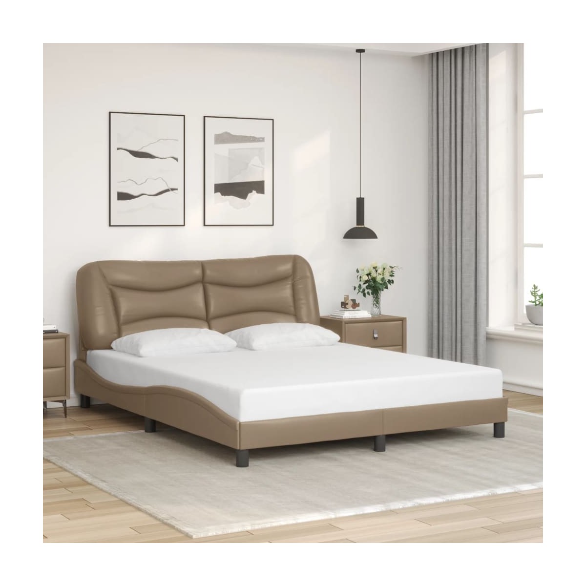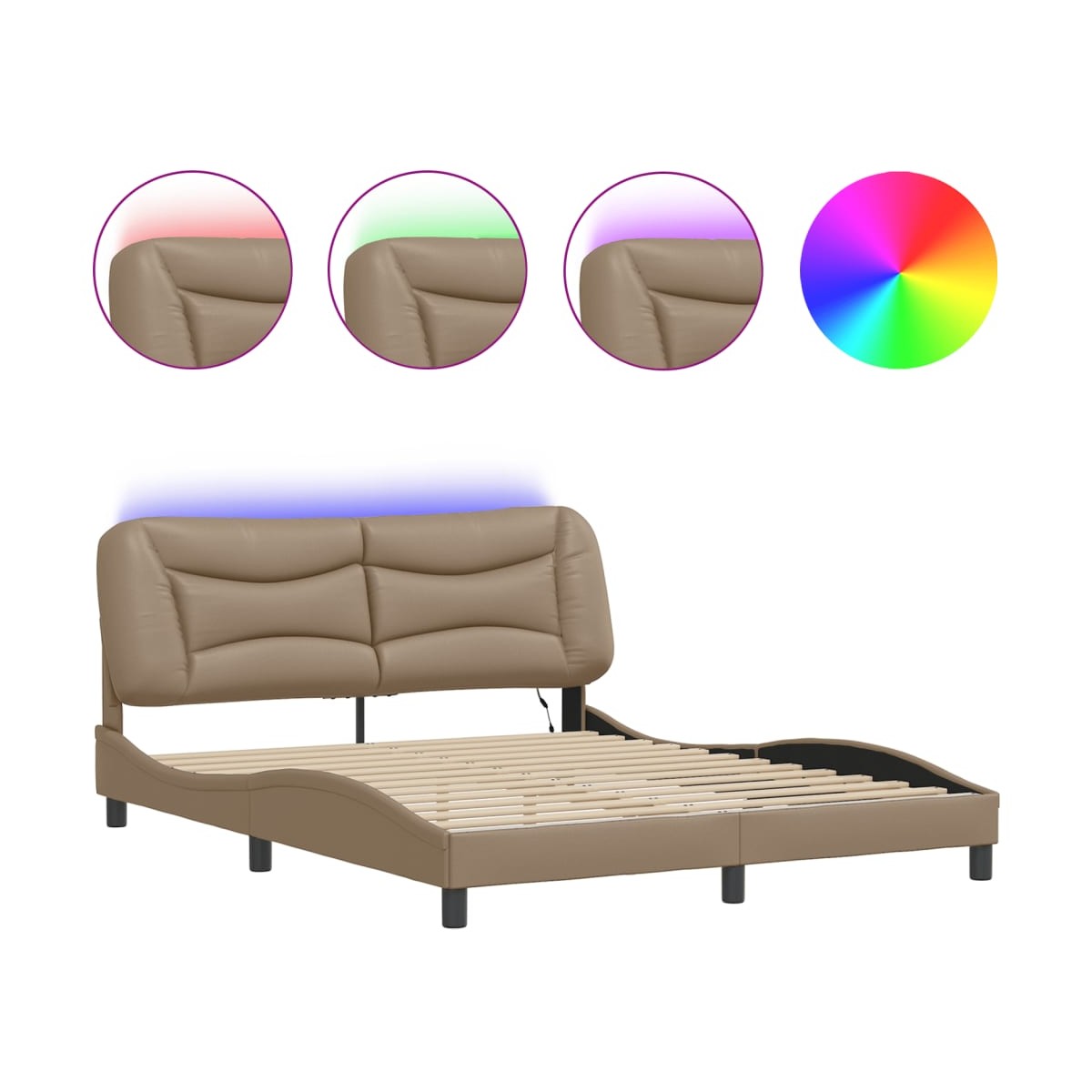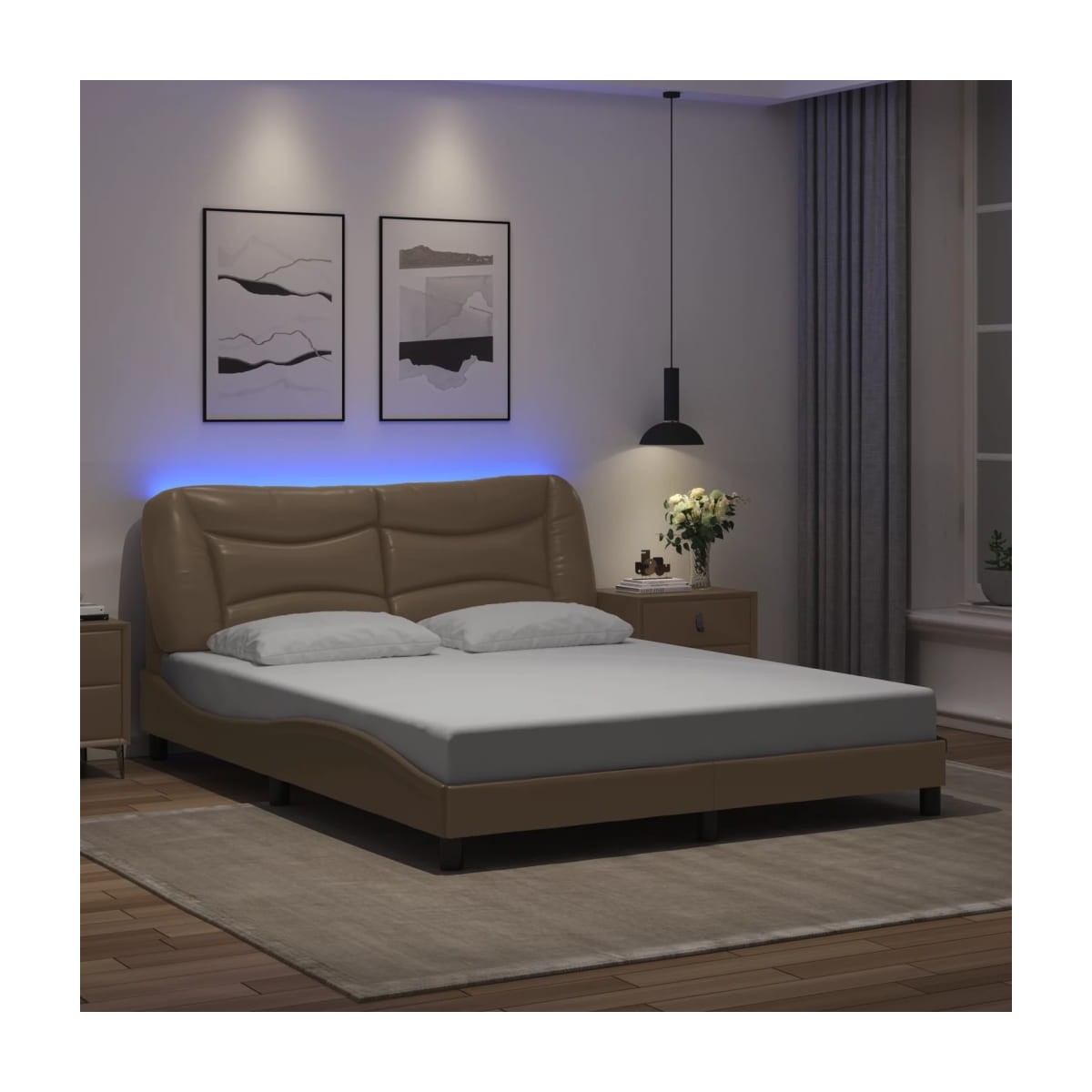 ¡Consigue tener un sueño reparador con esta estructura de cama con luces LED! Es un aporte acogedor para cualquier dormitorio. Material duradero: El cuero sintético de primera calidad es un material muy duradero. Es resistente a las manchas, por lo que es fácil de limpiar con un paño húmedo. Además, la superficie lisa da un aspecto lujoso y la belleza del cuero auténtico.Listones robustos: Los listones de madera contrachapada proporcionan una buena distribución del peso, lo que garantiza que el colchón se mantenga en tu sitio con cada giro y vuelta del cuerpo mientras duermes.Excelente apoyo: El cabecero de la cama te proporciona un excelente apoyo para la espalda mientras estás sentado en la cama para leer o ver la televisión.Tira de LED de colores: Alegra la oscuridad con luces LED de colores. Los cierres de gancho y bucle de la parte posterior del cojín del cabecero se pueden utilizar para fijar las luces LED.Diseño lateral ondulado: El look ondulado de la estructura de la cama es elegante y sofisticado, agregando un toque moderno y elegante a tu decoración, convirtiéndolo en el foco de atención de tu dormitorio. Información útil:El colchón no está incluido con la cama. Disponemos de una variada selección de colchones. Puedes echar un vistazo a nuestra tienda para buscar el colchón correspondiente.El producto tiene un conector USB que necesita una fuente de alimentación USB certificada de 5 V (no incluida).