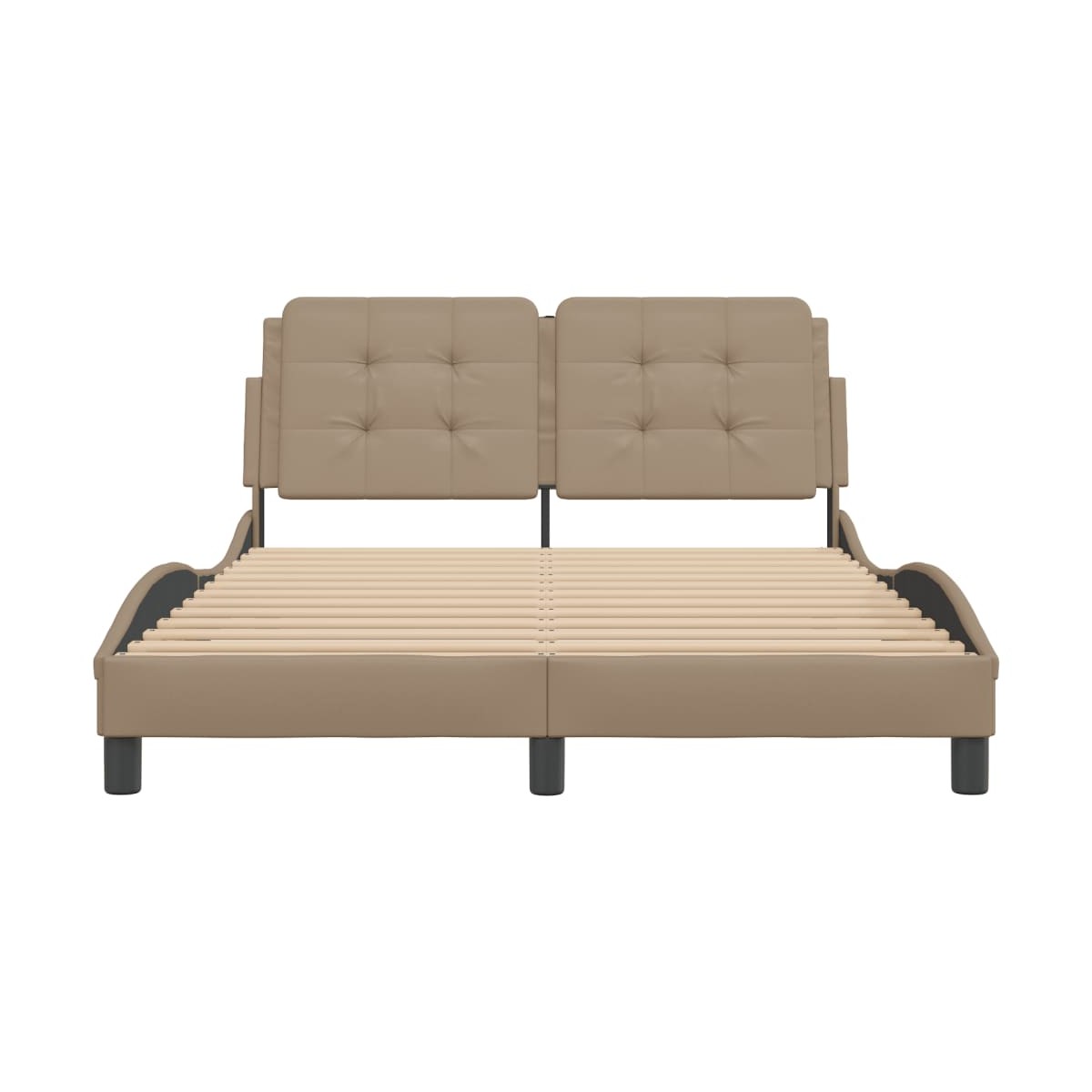 ¡Consigue un sueño más reparador con esta estructura de cama con cabecero! Es un aporte acogedor para cualquier dormitorio. Material duradero: El cuero sintético de primera calidad es un material muy duradero. Es resistente a las manchas, por lo que es fácil de limpiar con un paño húmedo. Además, la superficie lisa da un aspecto lujoso y la belleza del cuero auténtico.Listones robustos: Los listones de madera contrachapada proporcionan una buena distribución del peso, lo que garantiza que el colchón se mantenga en tu sitio con cada giro y vuelta del cuerpo mientras duermes.Excelente soporte: El cabecero acolchado está relleno de espuma para una comodidad ultrasuave y óptima, lo que te brinda un excelente soporte para la espalda mientras estás sentado en la cama para leer o ver la televisión.Diseño práctico: El cabecero acolchado tiene una cremallera para facilitar su instalación.Diseño lateral ondulado: El look ondulado de la estructura de la cama es elegante y sofisticado, agregando un toque moderno y elegante a tu decoración, convirtiéndolo en el foco de atención de tu dormitorio. Información útil:El colchón no está incluido con la cama. Disponemos de una variada selección de colchones. Puedes echar un vistazo a nuestra tienda para buscar el colchón correspondiente.