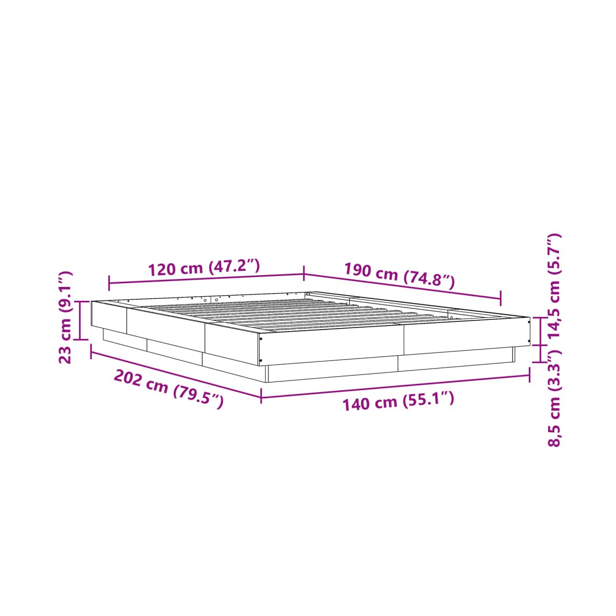 - Dimensiones totales: 202 x 140 x 23 cm (largo x ancho x alto)