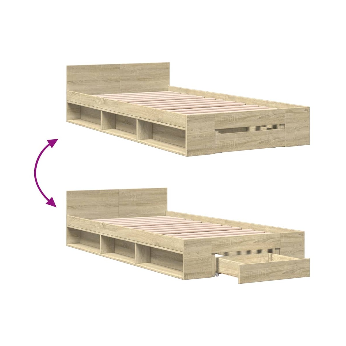 ¡Añade un toque moderno a tu dormitorio con esta estructura de cama con cajón! Es un aporte práctico y decorativo para tu hogar. Material duradero: La estructura de la cama está hecha de madera de ingeniería. La madera de ingeniería tiene una calidad excepcional, con una superficie lisa y también con fuerza, estabilidad y resistencia a la humedad.Listones robustos: Los listones de madera contrachapada proporcionan una buena distribución del peso, lo que garantiza que el colchón se mantenga en tu sitio con cada giro y vuelta del cuerpo mientras duermes.Función de almacenamiento: El cajón de la cama y los compartimentos laterales incluidos brindan un amplio espacio de almacenamiento para guardar tus elementos esenciales, manteniendo tu habitación limpia y ordenada. Información útil:El colchón no está incluido con la cama. Disponemos de una variada selección de colchones. Puedes echar un vistazo a nuestra tienda para buscar el colchón correspondiente.