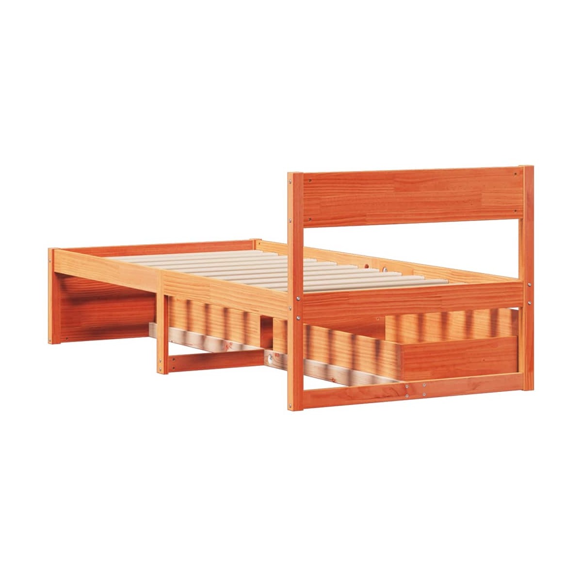 ¡Añade un toque moderno a tu dormitorio con esta estructura de cama con cajones! Es un aporte práctico y decorativo para tu hogar. Estructura estable y duradera: La madera de pino maciza es conocida por su resistencia y durabilidad. Sus vetas rectas y sus característicos nudos contribuyen a su encanto rústico.Listones robustos: Los listones de madera contrachapada proporcionan una buena distribución del peso, lo que garantiza que el colchón se mantenga en tu sitio con cada giro y vuelta del cuerpo mientras duermes.Función de almacenaje: Los cajones de cama incluidos proporcionan amplio espacio de almacenamiento para guardar cosas básicas, y mantienen la habitación limpia y ordenada.Cabecero versátil: Esta estructura de cama viene con un cabecero que proporciona un excelente soporte para la espalda cuando te sientas en la cama para leer o ver la televisión, a la vez que sirve como elemento decorativo. Información útil:El colchón no está incluido con la cama. Disponemos de una variada selección de colchones. Puedes echar un vistazo a nuestra tienda para buscar el colchón correspondiente.