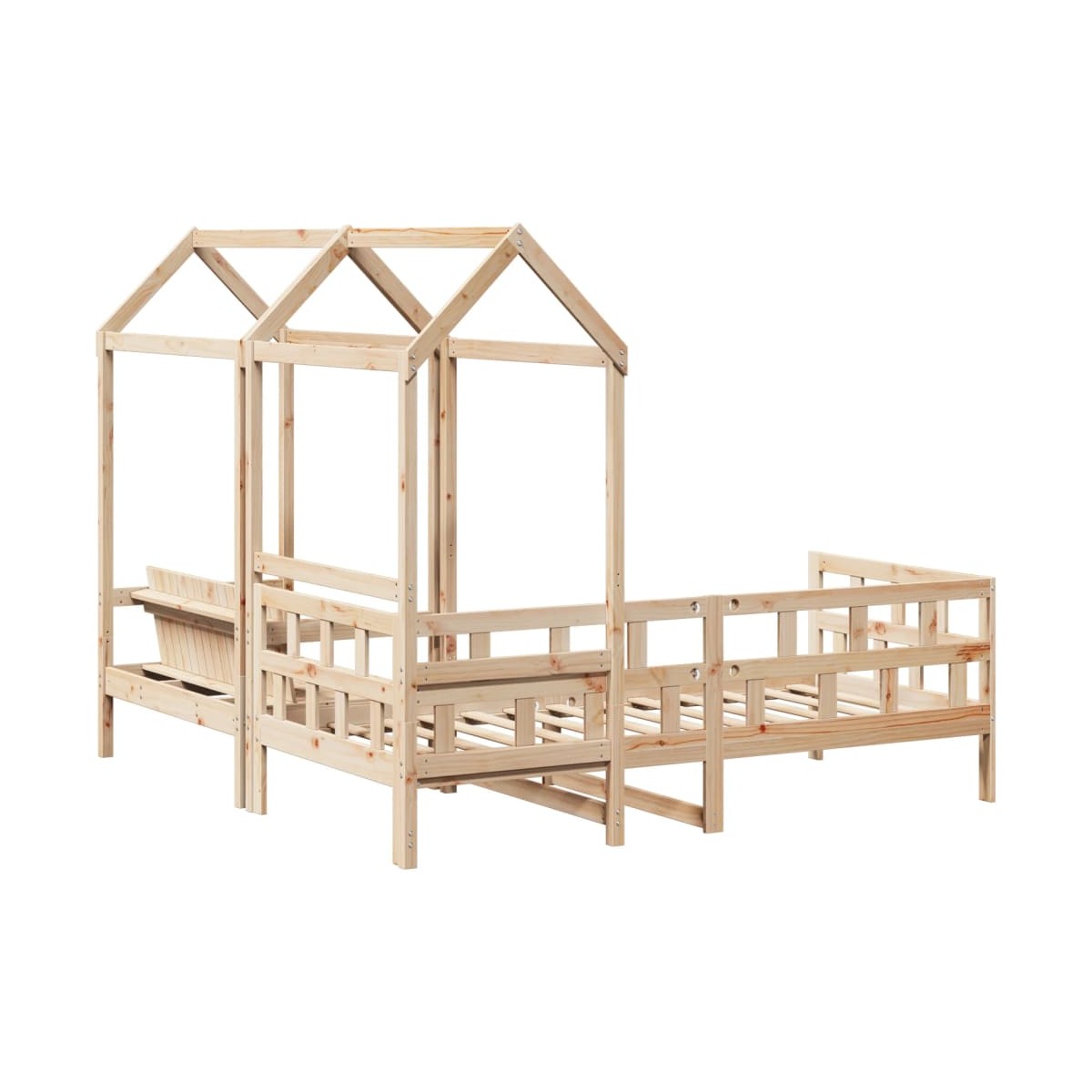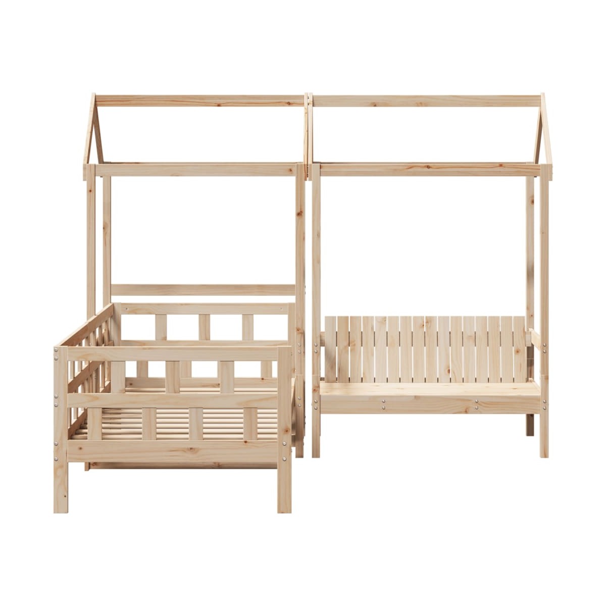 Este versátil juego de sofá cama de madera se puede utilizar como juego de cama en el dormitorio y también es ideal como juego de sofá en la sala de estar. Se adapta perfectamente a tus diferentes necesidades, lo que te proporciona mucho espacio para dormir y descansar. Madera de pino maciza: La madera de pino maciza es un bonito material natural. La madera de pino tiene vetas rectas, y los nudos dan al material su distintivo aspecto rústico.Barras de cama de 3 lados: Esta cama tiene un diseño único en el lateral de la cama, que proporciona una sensación de seguridad y además añade un toque de estilo sofisticado a tu hogar.Diseño de listones: El somier de madera proporciona una mejor circulación del aire para mantener el colchón fresco durante más tiempo, además de mejorar la capacidad de carga de la cama y de asegurar su estabilidad.Espacio de almacenamiento adicional: Aprovecha al máximo el espacio que hay debajo de la cama para guardar varios objetos. Ideal para guardar cajas para organizar tu ropa, juguetes o edredones.Gran diversión: Al combinar el techo con tu sofá cama, puedes crear un escondite que le ofrezca a tu hijo mucha diversión a la hora de acostarse. Este innovador añadido al cuarto no solo será un punto emocionante, sino que también traerá asombro y emoción a la habitación.Puerta lateral abierta: El techo cuenta con una puerta lateral abierta, lo que facilita el acceso para que tus hijos entren y salgan de la cama. Información útil:El colchón no está incluido con la cama. Disponemos de una variada selección de colchones. Puedes echar un vistazo a nuestra tienda para buscar el colchón correspondiente.