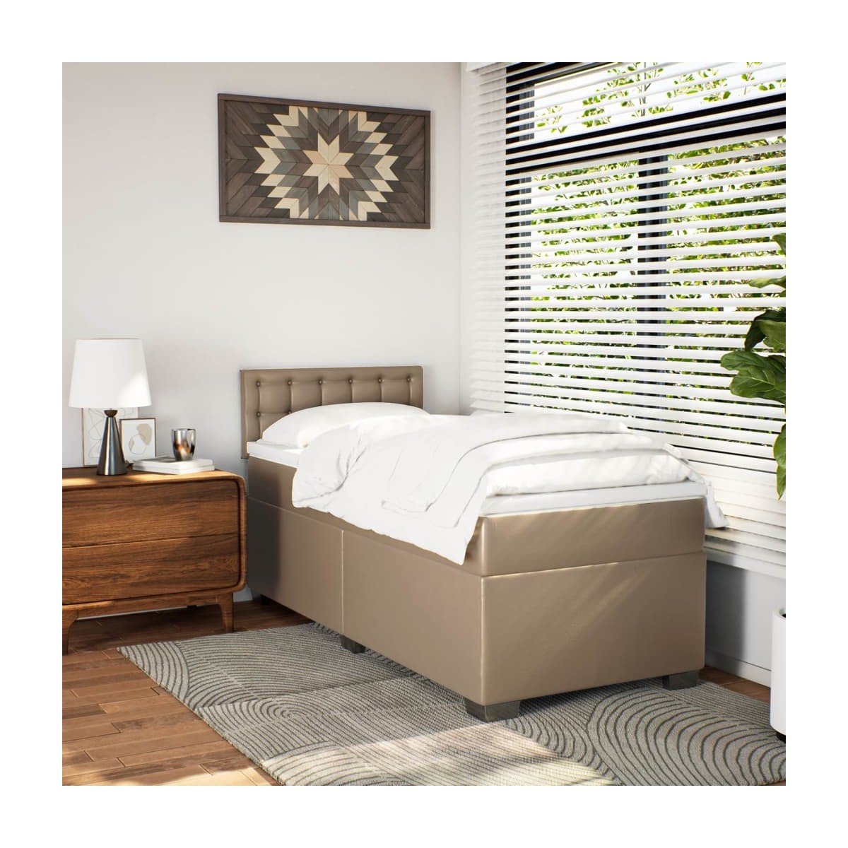 Utiliza esta cama de muelles para disfrutar de un sueño reparador. Te ofrece la máxima relajación y un sueño placentero. Material duradero: El cuero sintético de primera calidad es un material muy duradero. Es resistente a las manchas, por lo que es fácil de limpiar con un paño húmedo. Además, la superficie lisa da un aspecto lujoso y la belleza del cuero auténtico.Colchón de muelles ensacados: Este colchón de muelles ensacados cuenta con muelles ensacados individuales que funcionan de forma independiente para proporcionar un apoyo personalizado reaccionando únicamente a la presión de cada zona. Este diseño evita que se enrolle y reduce la transferencia de movimiento en comparación con los colchones tradicionales de bobina abierta. Cada muelle ensacado sostiene el cuerpo individualmente.Cubrecolchón cómodo: Este cubrecolchón mejora el soporte y la comodidad con su superficie suave y transpirable al tiempo que prolonga la vida útil de su colchón. Su funda extraíble permite un fácil lavado, lo que facilita el mantenimiento.Excelente apoyo: El cabecero de la cama te proporciona un excelente apoyo para la espalda mientras estás sentado en la cama para leer o ver la televisión.Patas estables y duraderas: Esta cama está sostenida por patas resistentes, lo que garantiza estabilidad, seguridad y firmeza. Información útil:Por razones de higiene, el colchón no puede devolverse si se ha quitado o abierto el embalaje.