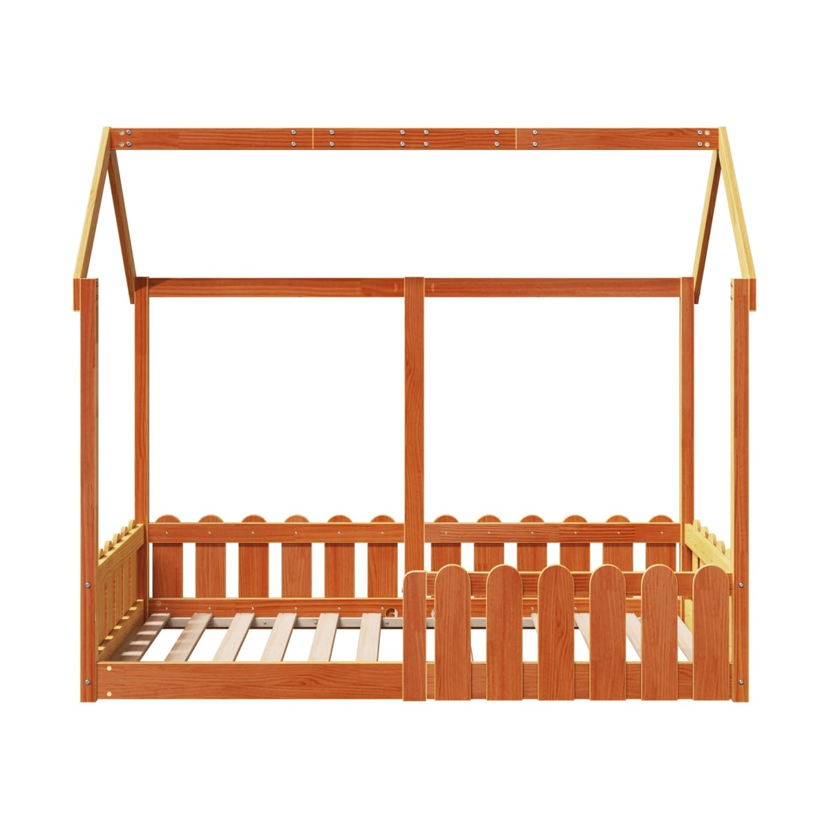 A tu hijo le encantará esta fantástica estructura de cama para niños con forma de casa de madera, tanto si está soñando con su próxima aventura como si se está durmiendo.Estructura estable y duradera: La madera de pino maciza es conocida por su resistencia y durabilidad. Sus vetas rectas y sus característicos nudos contribuyen a su encanto rústico.Diseño de casa divertido: Esta estructura de cama inspirada en una divertida casa transforma la hora de dormir en una aventura para los niños. Proporciona un lugar acogedor para la hora de dormir y una zona lúdica para el juego imaginativo.Cama de piso bajo: Este marco de cama está diseñado específicamente para estar cerca del suelo, lo que hace que sea más seguro y accesible para que tu hijo se mueva y se meta y salga de la cama de forma independiente.Barandillas para mayor seguridad: Esta estructura de cama está equipada con barandillas laterales para evitar que tu hijo se caiga de la cama mientras duerme.Estructura de techo abierto DIY: La estructura de techo abierto ofrece infinitas posibilidades de diseño, lo que le permite colgar fácilmente decoraciones o colocar una carpa de juego para crear un espacio verdaderamente mágico y personalizado.Información útil:El colchón no está incluido con la cama. Disponemos de una variada selección de colchones. Puedes echar un vistazo a nuestra tienda para buscar el colchón correspondiente.